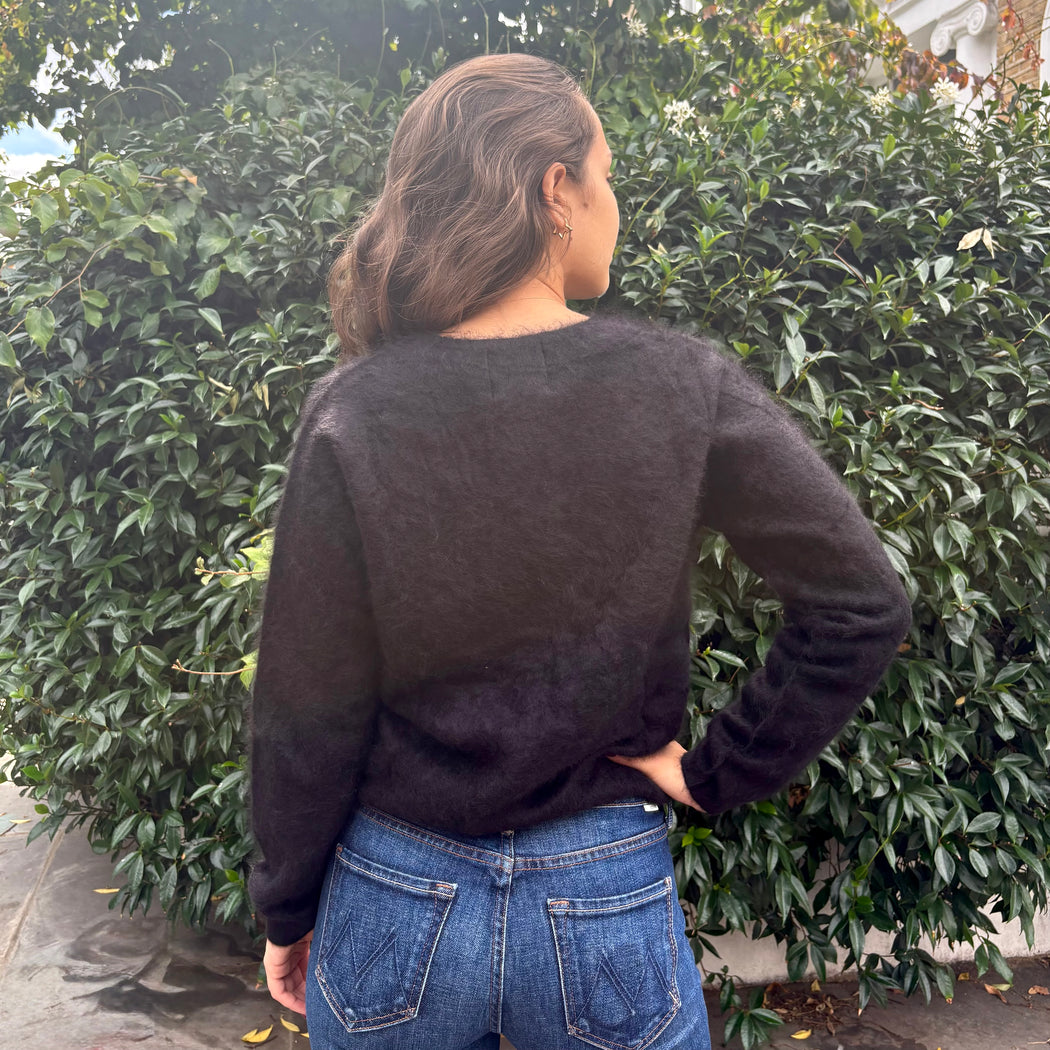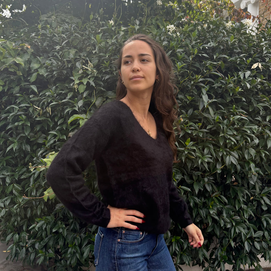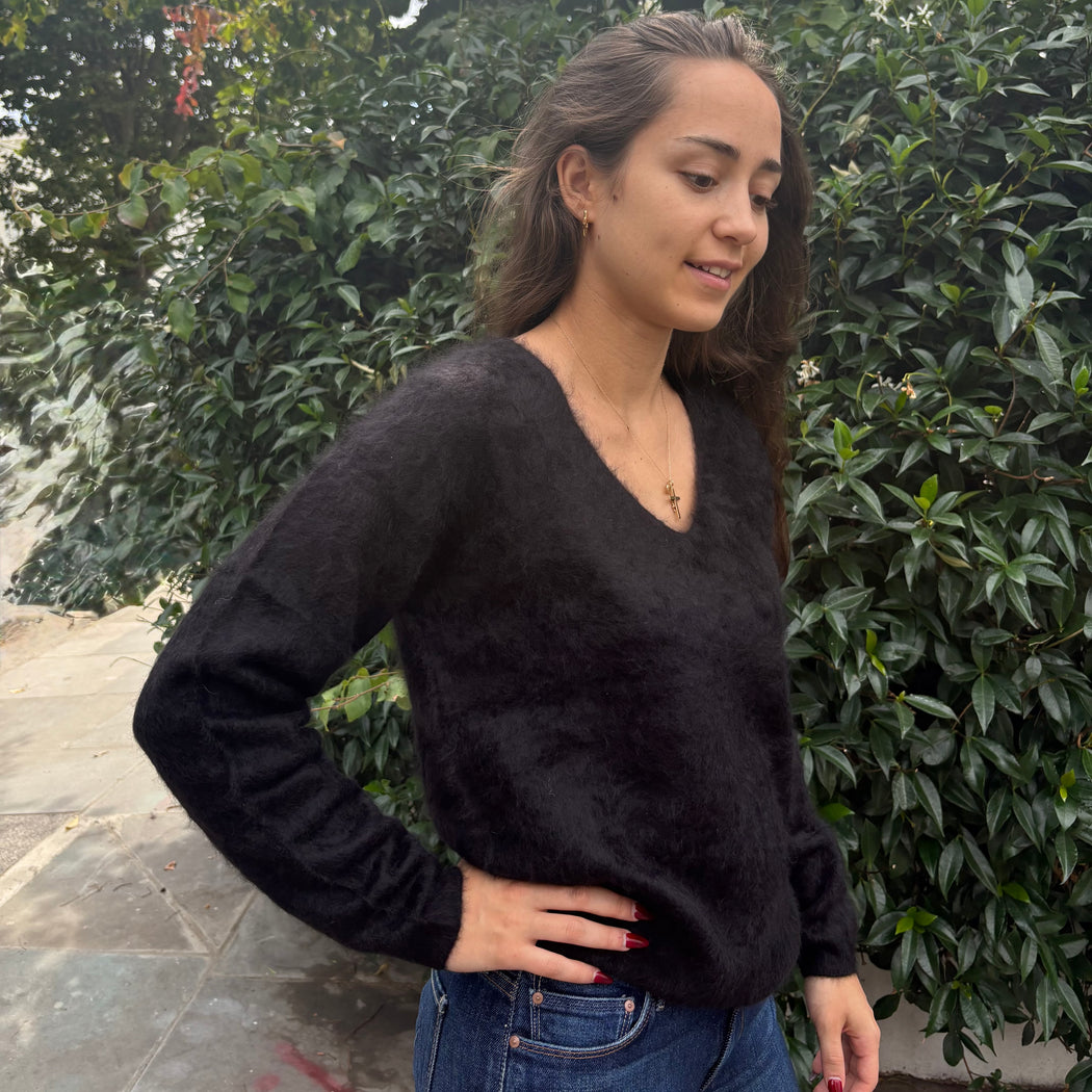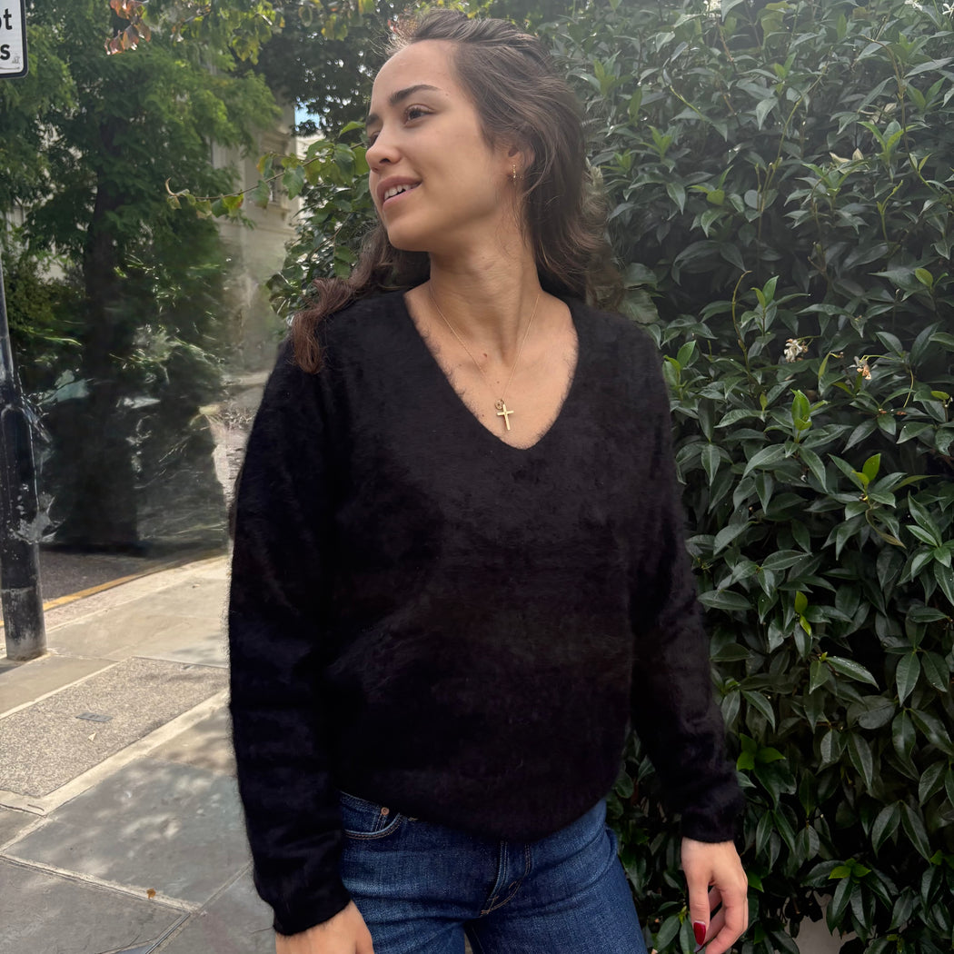 Brushed cashmere vee neck jumper in black. Brushed cashmere is super soft, once the jumper is knitted it is then brushed to give it a more fluffy handle.