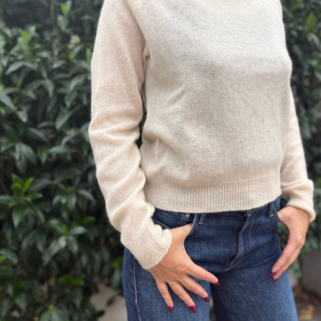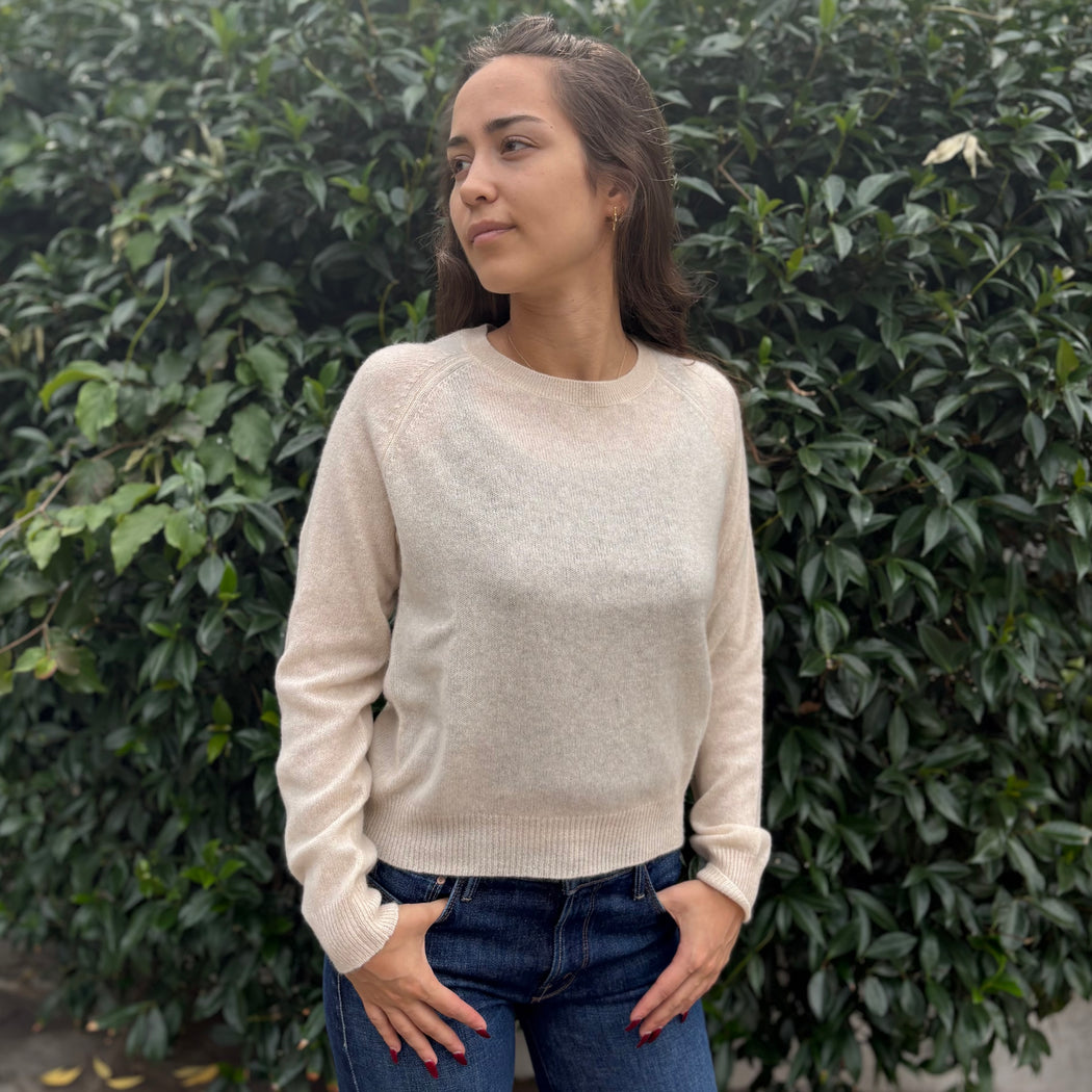 J1234's lightweight cashmere crew neck in oatmeal with raglan sleeves and slightly shorter in the body than the 'classic fit'.