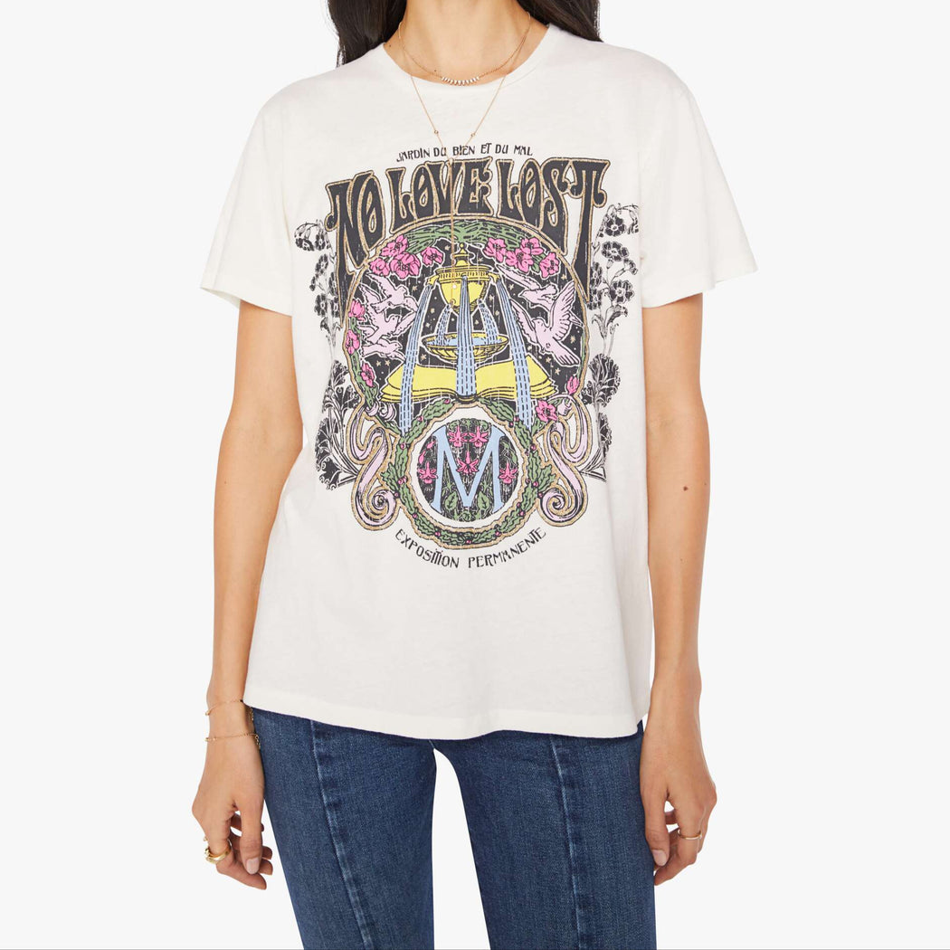 A crewneck tee with an oversized fit and a clean hem. Made from 100% cotton, the white tee features a fountain graphic with text and floral details on the front.