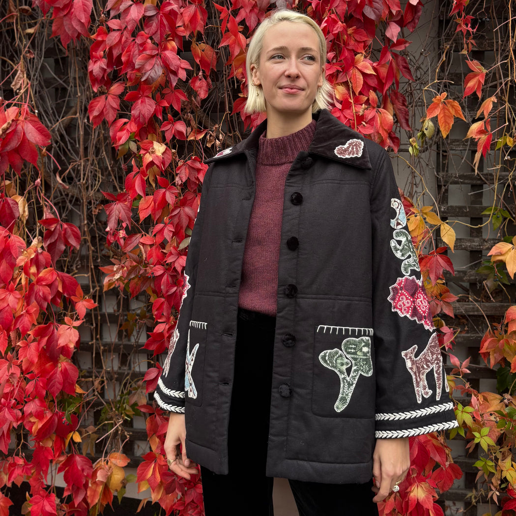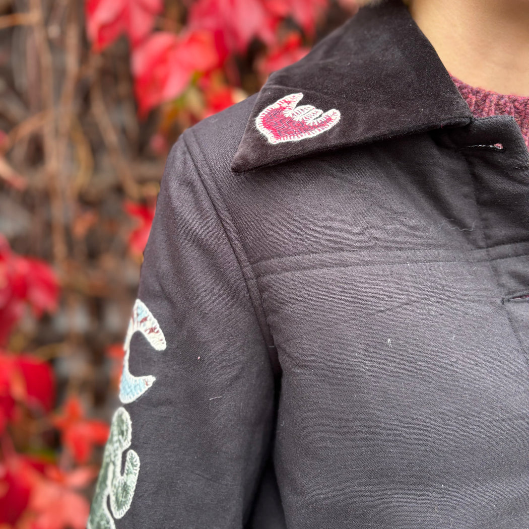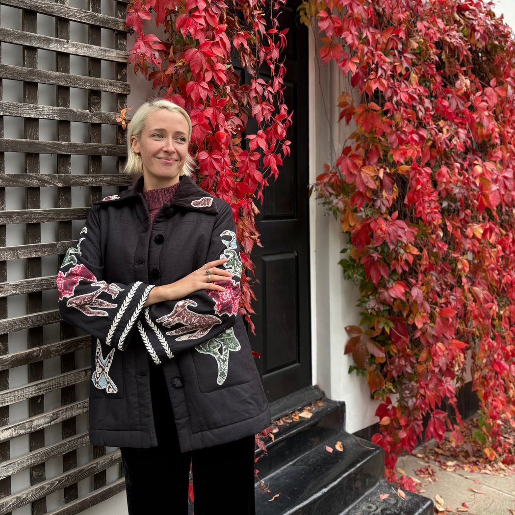 This beautiful jacket is carefully handmade and hand embroidered in India. The delicate embroidery is done by a group of talented women in Mumbai.