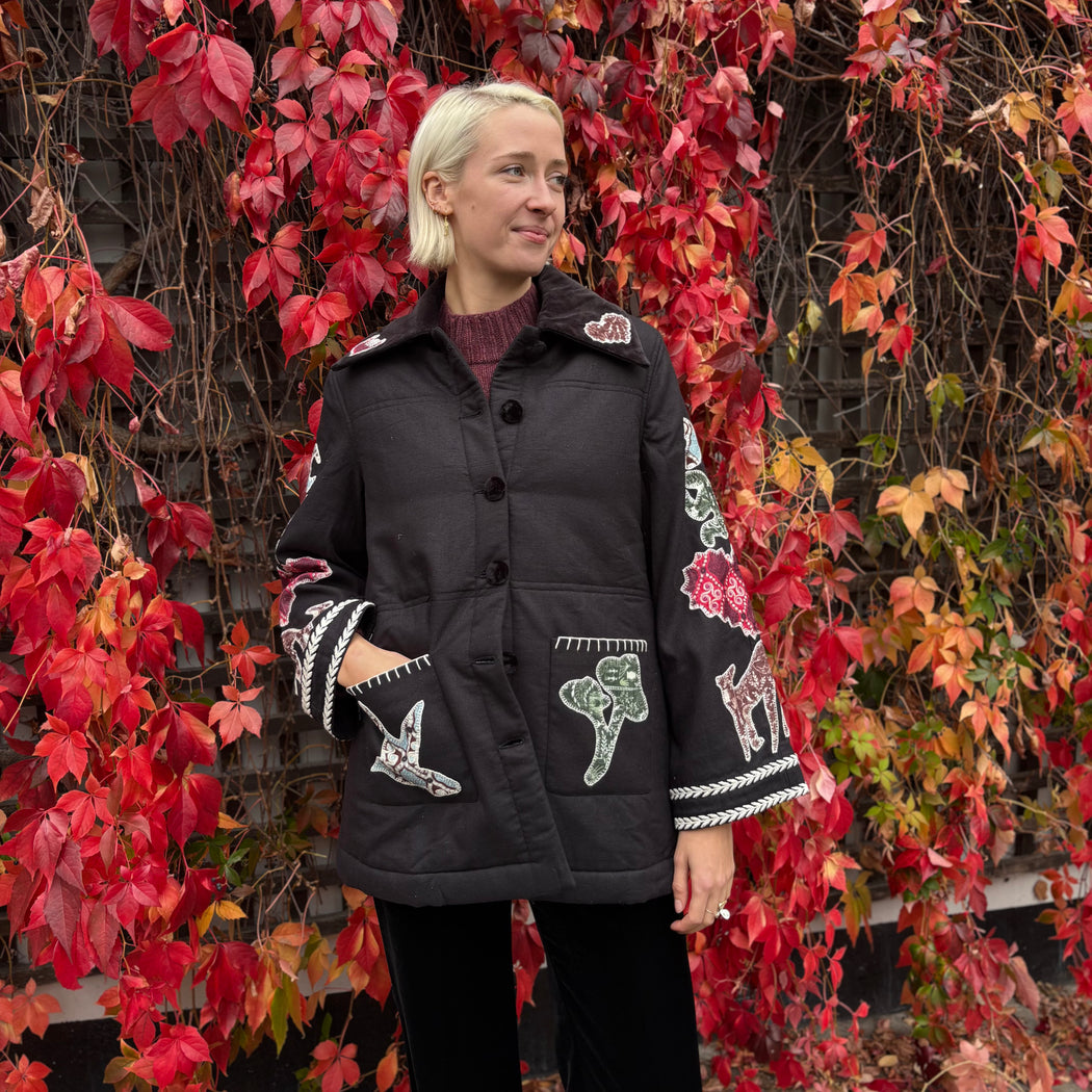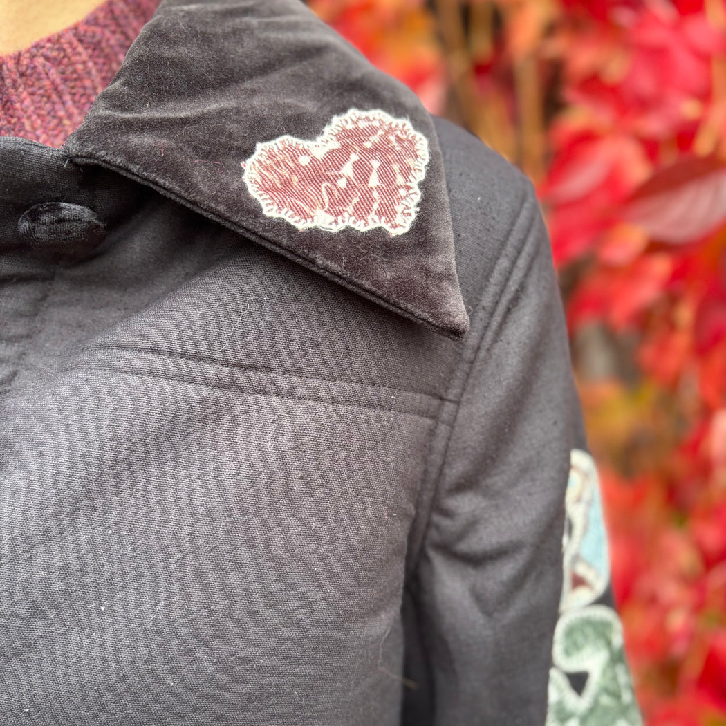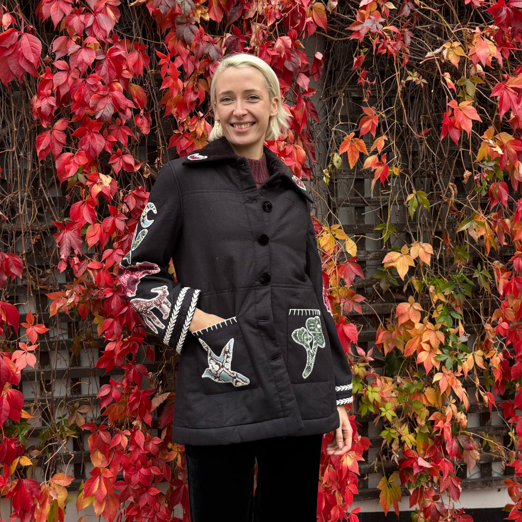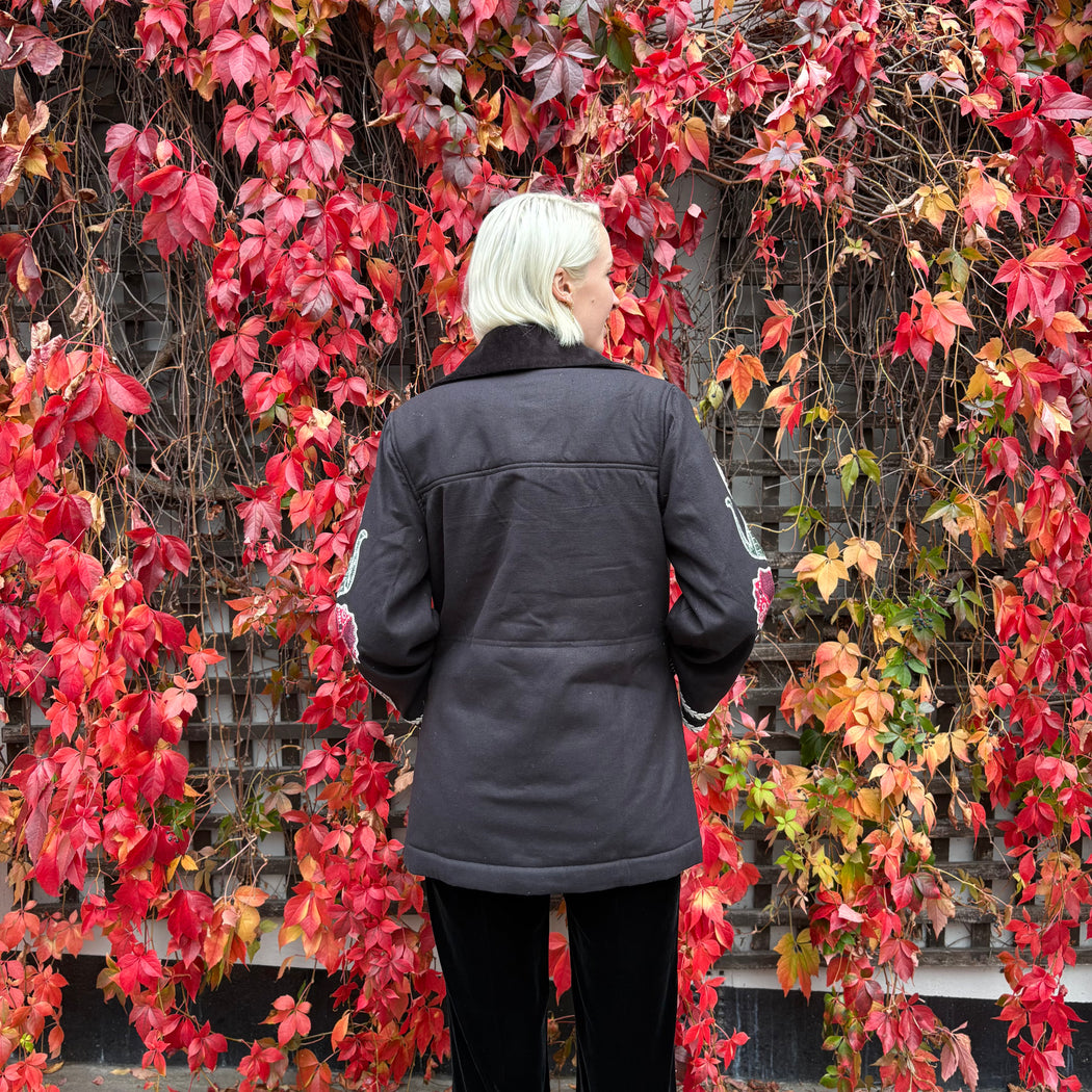This beautiful jacket is carefully handmade and hand embroidered in India. The delicate embroidery is done by a group of talented women in Mumbai.