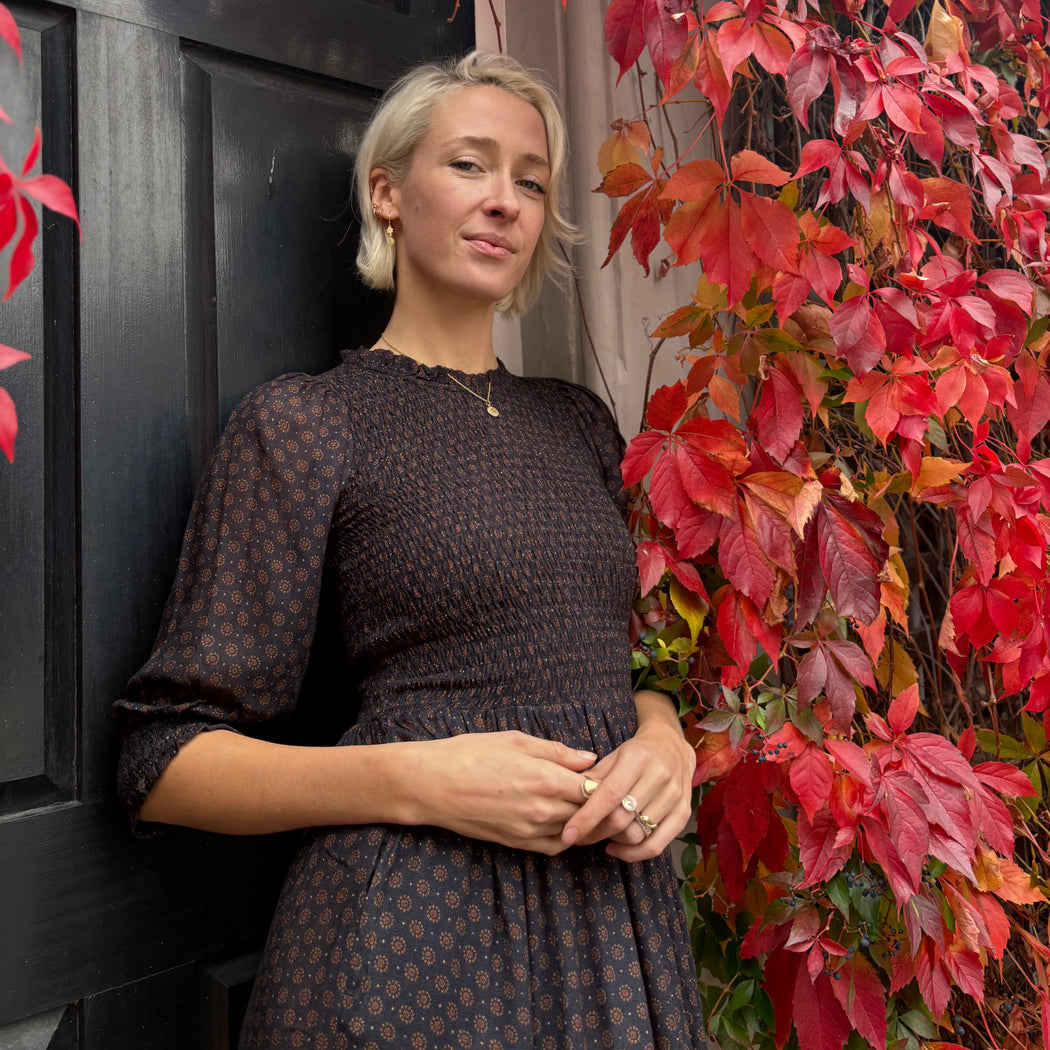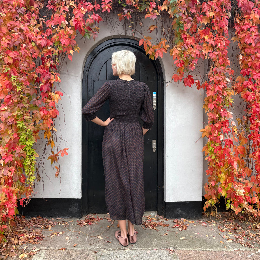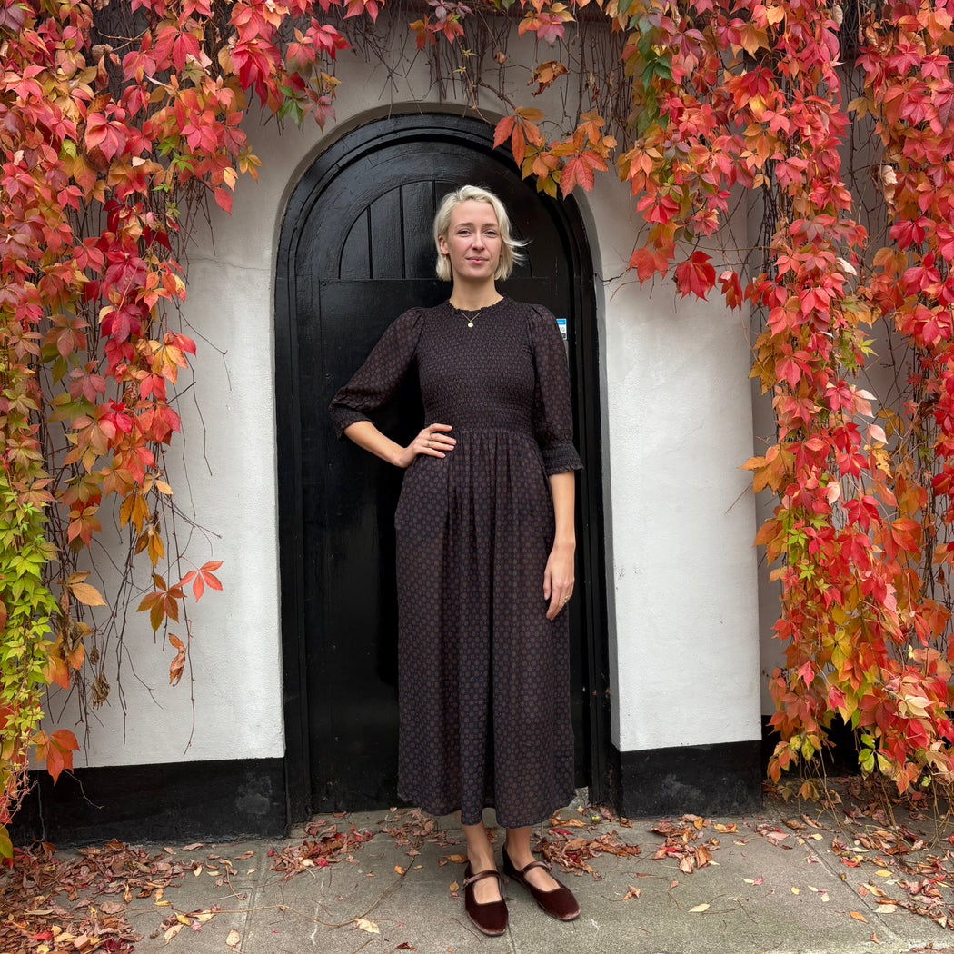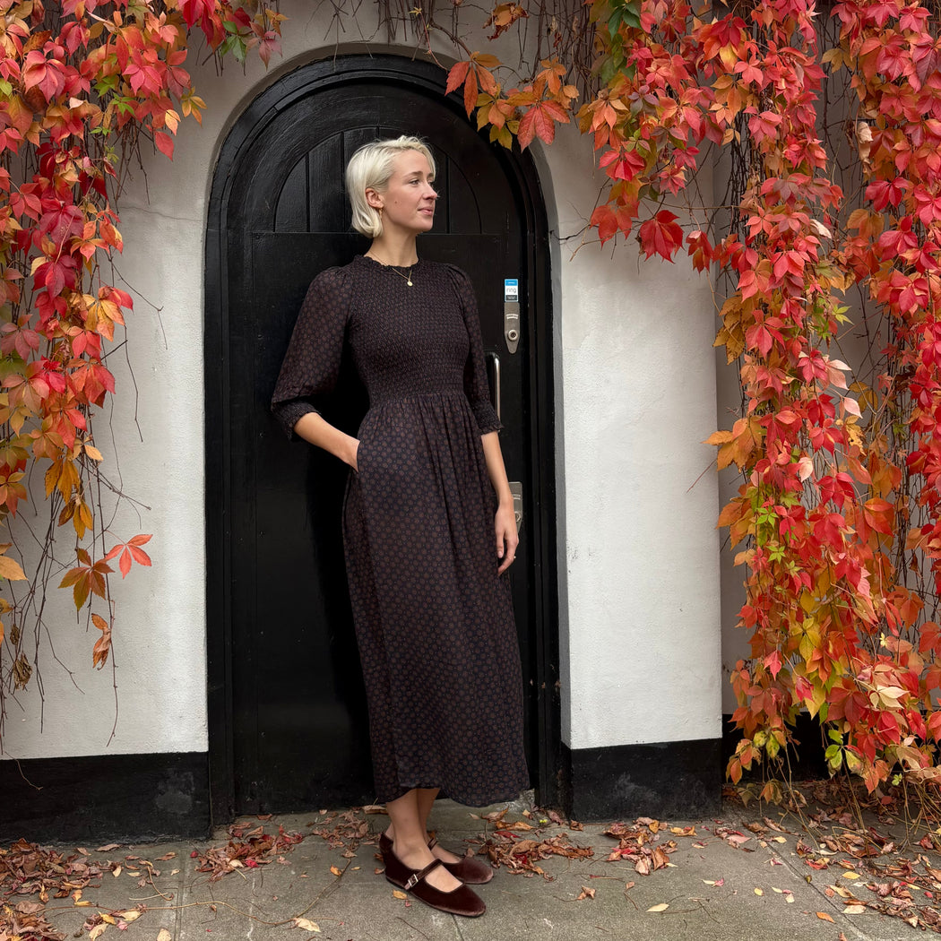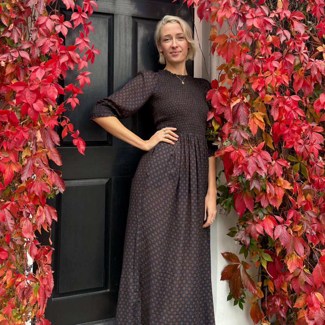 A stunning silk dress with a smocked bodice and cuffs. The Julia dress comes this season in Muzungu's "Hilltop" print.