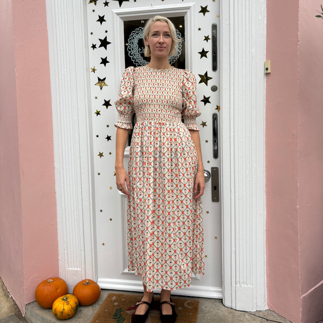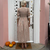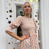 A stunning cotton dress with a smocked bodice and cuffs. The Julia dress comes this season in Muzungu's "Heart in Hand" print.