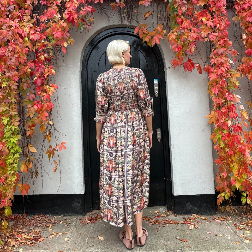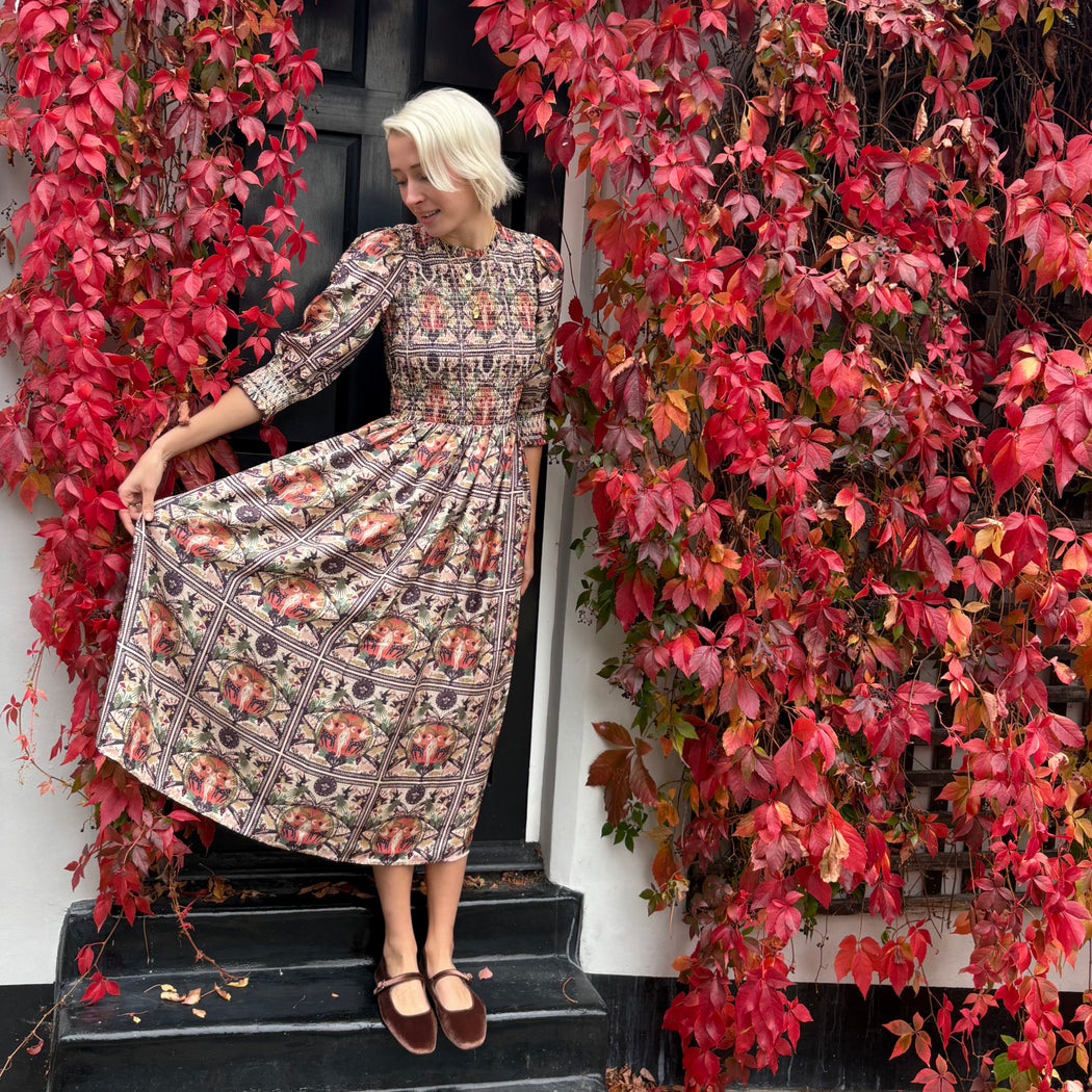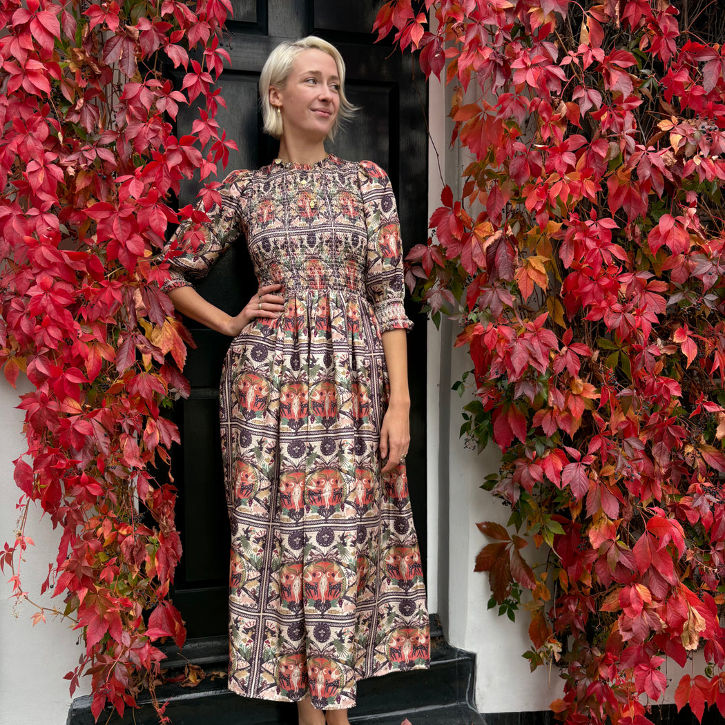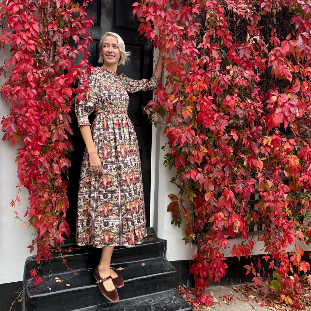 A stunning silk dress with a smocked bodice and cuffs. The Julia dress comes this season in Muzungu's "Mother Earth" print.