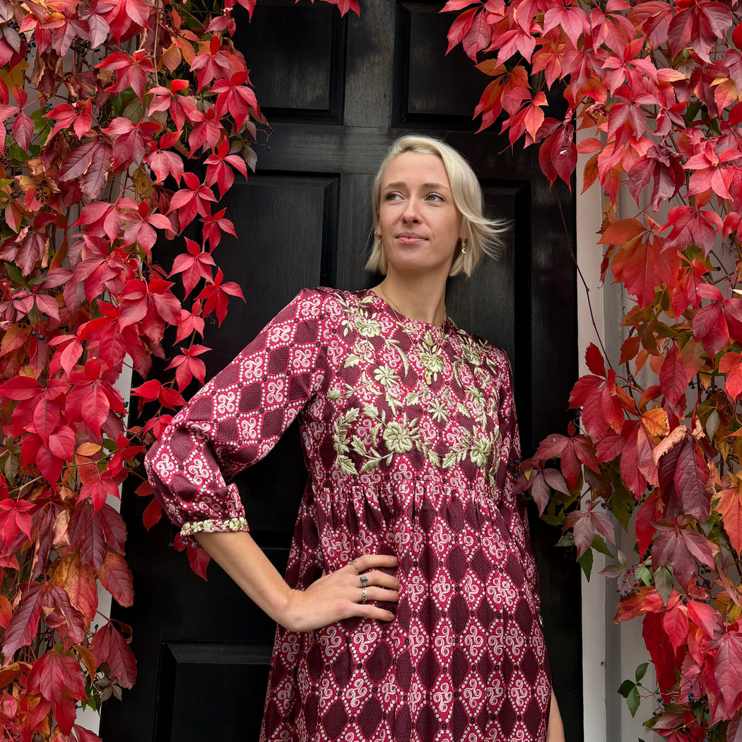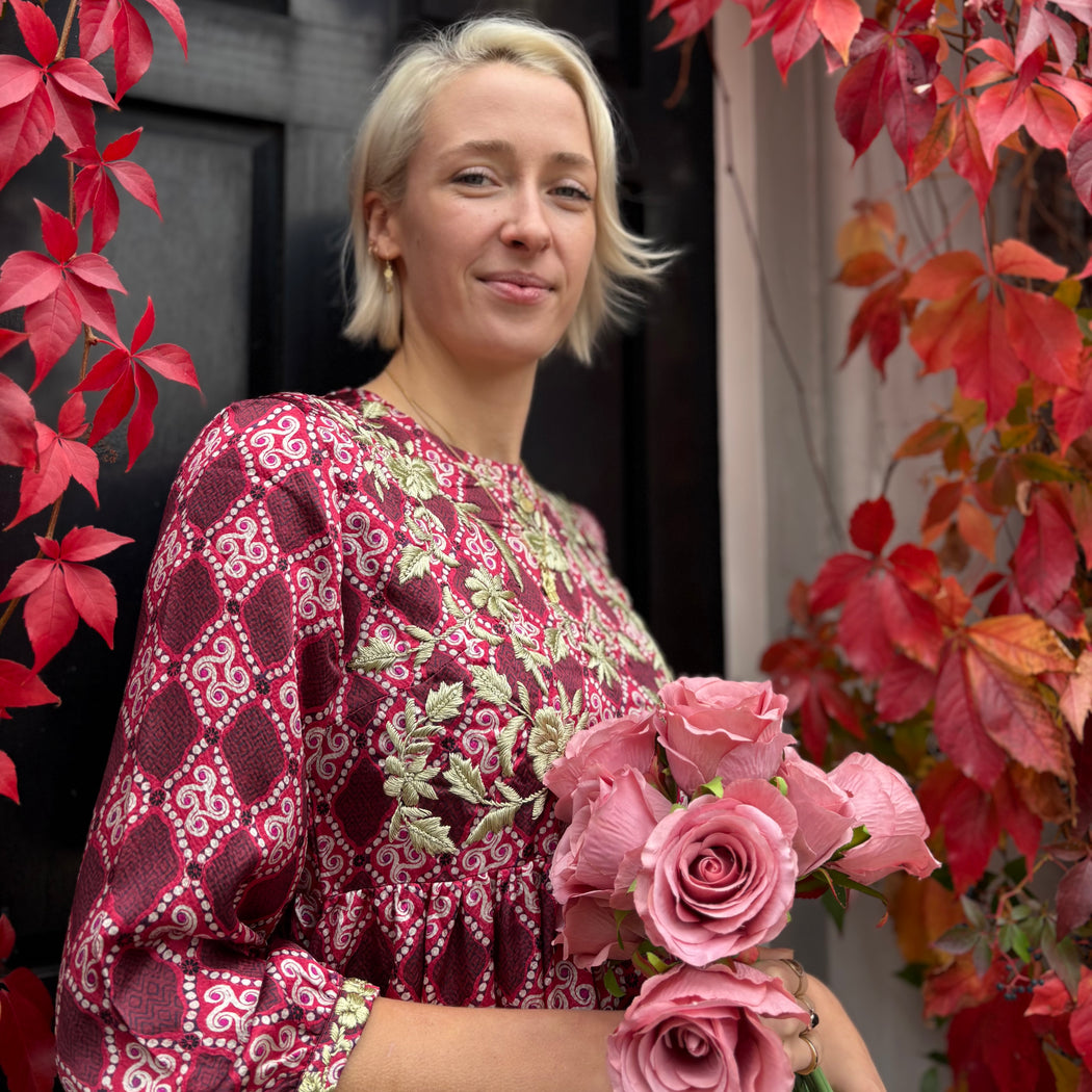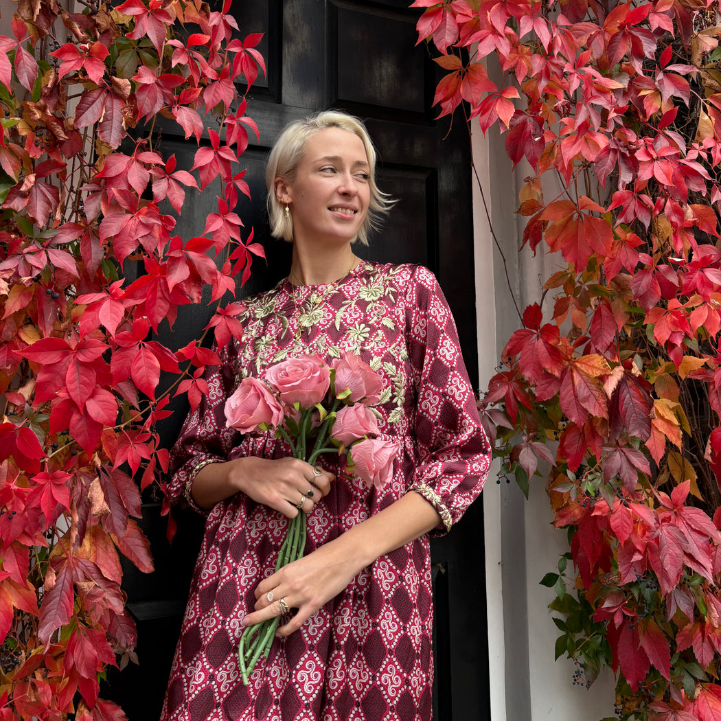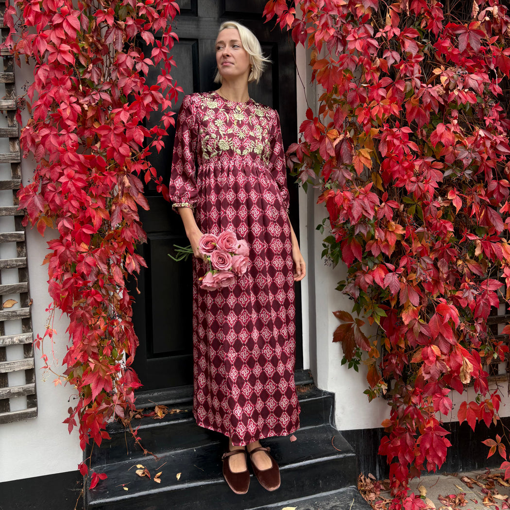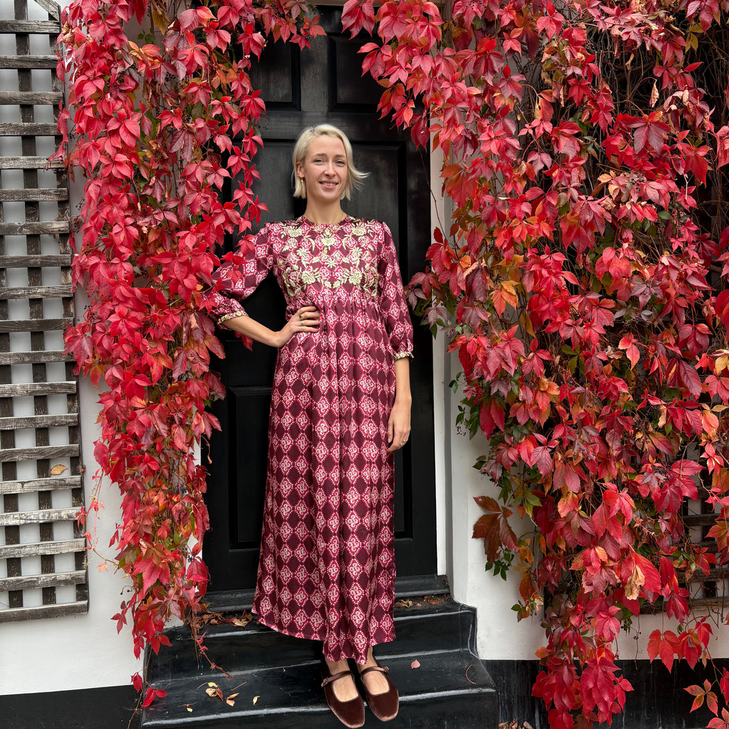 Garnet silk dress with gold hand embroidery. This dress is carefully handmade and hand-embroidered in India. The delicate traditional embroidery on this dress is done by talented embroiderers in Mumbai, India.