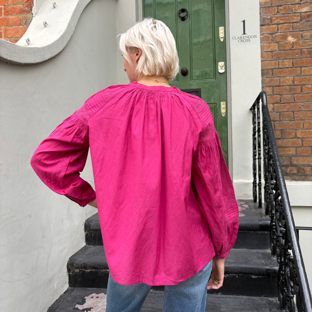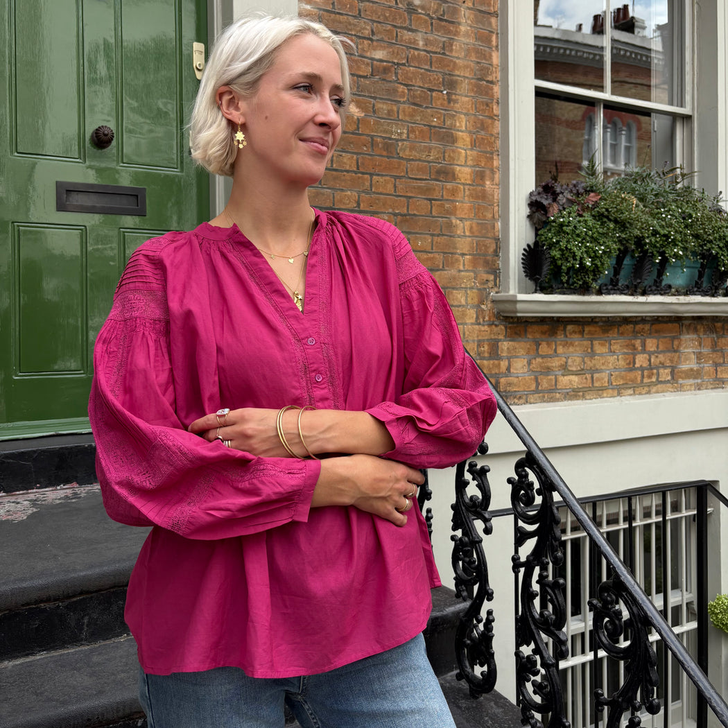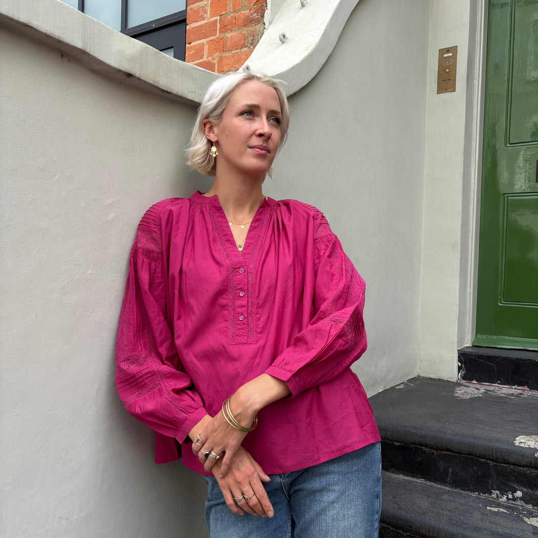 The Nipoa blouse, an easy top with elegant puff sleeves. Crafted in a soft cotton, with a buttoned V-neck. Details include a flat collar and gathered top stitching at the shoulders.