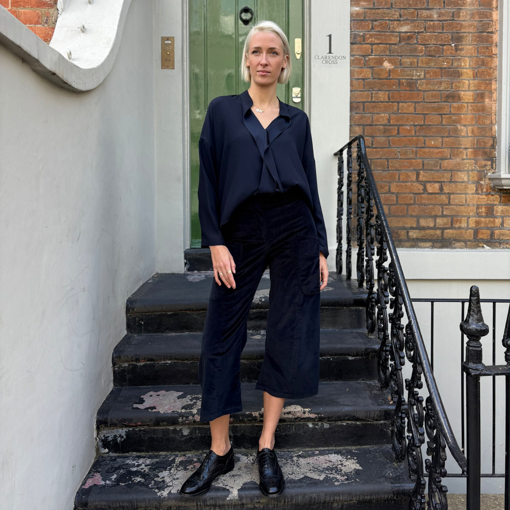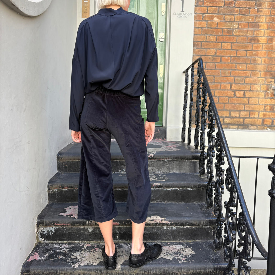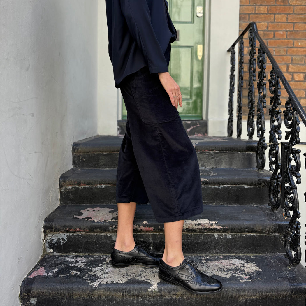 An ultra-soft corduroy cropped pant that features front patch pockets, a wide leg with curved silhouette. It has a front zip and hook closure. A soft narrow-wale cotton with a hint of elastane for that comfort of stretch.