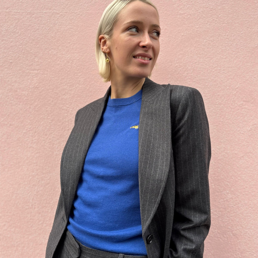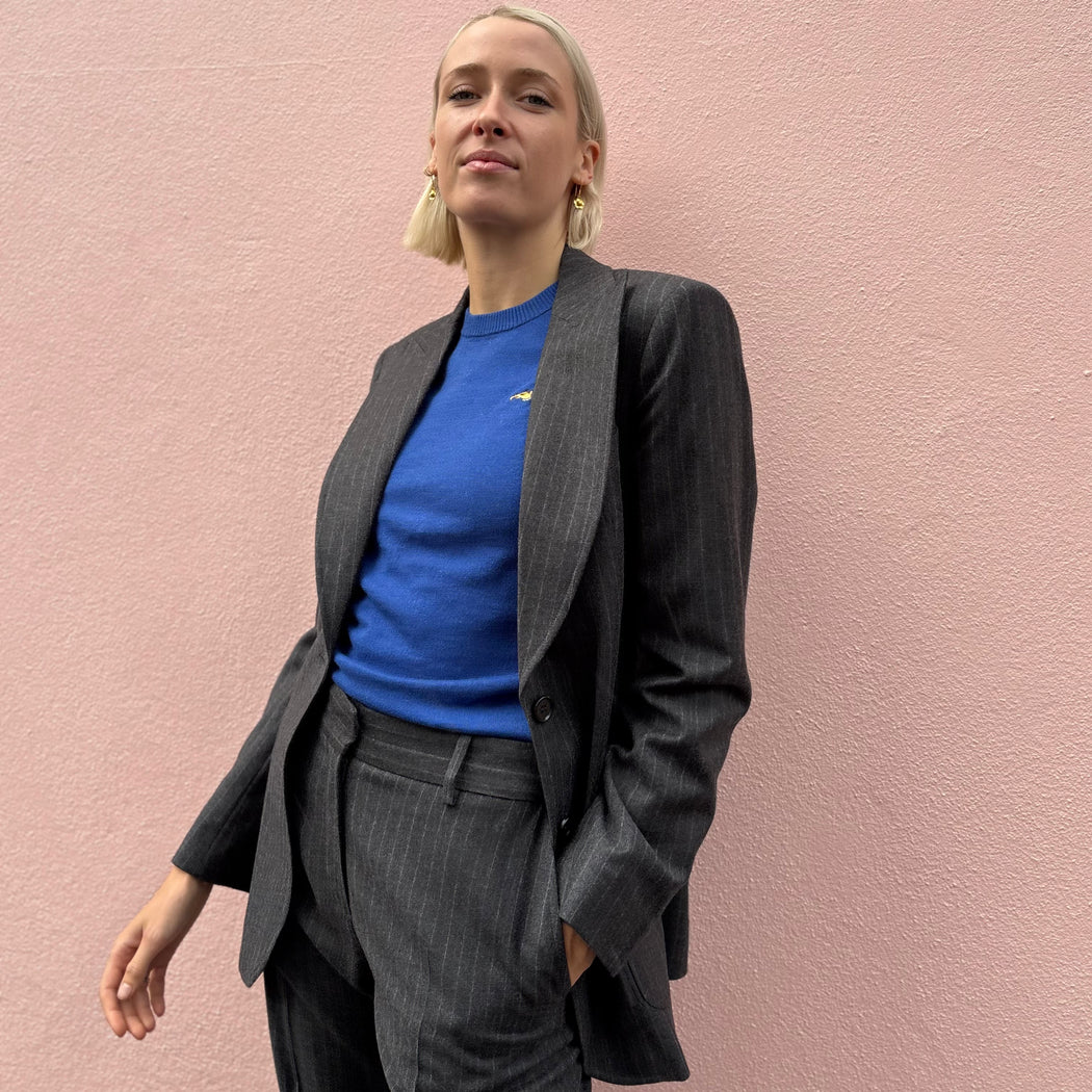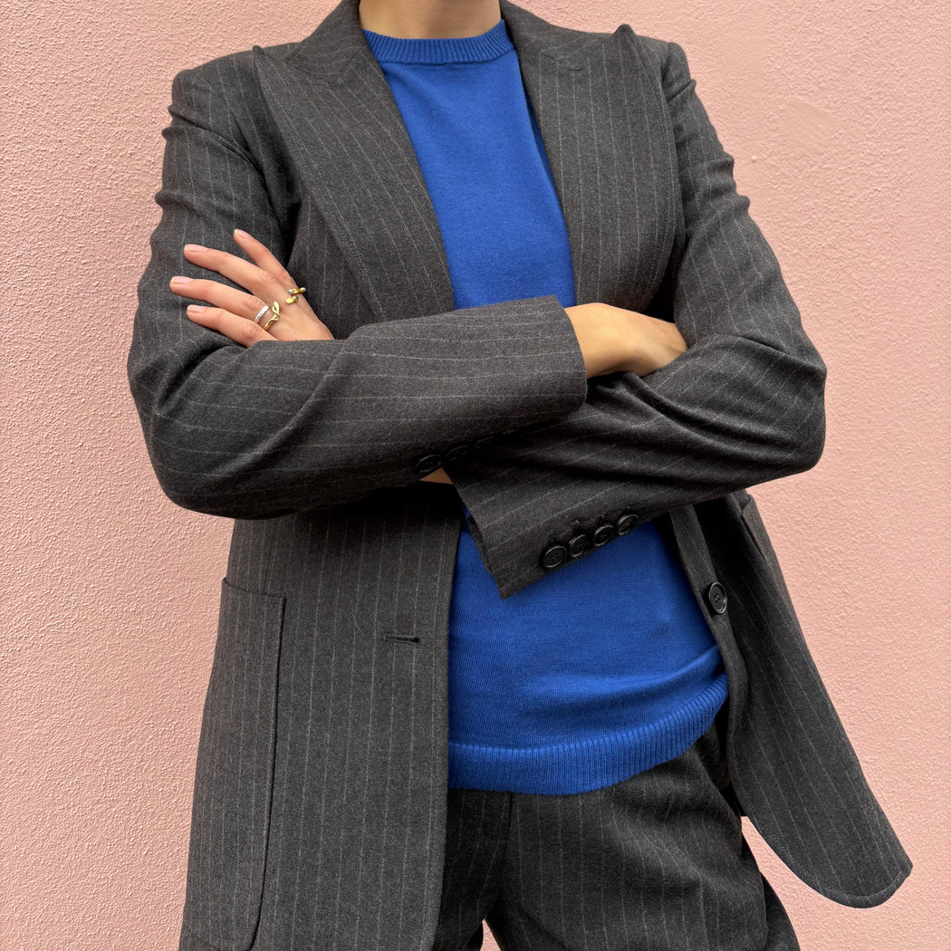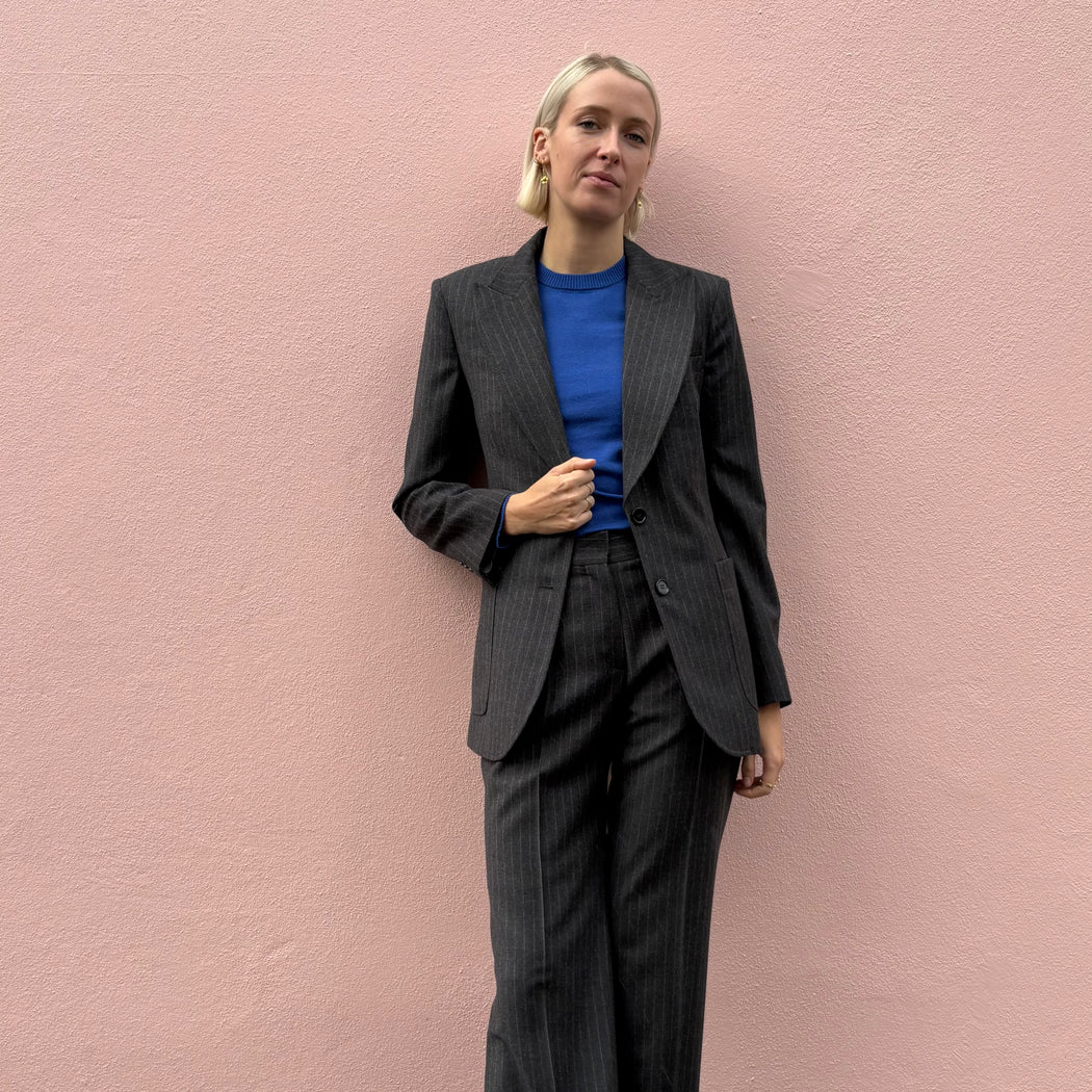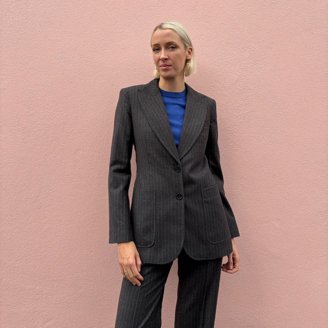 A wonderfully tailored British wool jacket with wide lapels and patch pockets, featuring a classic pinstripe. Coming in a grey shade.