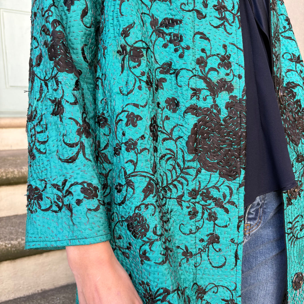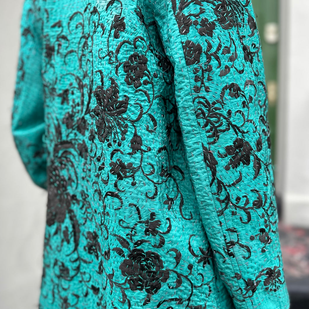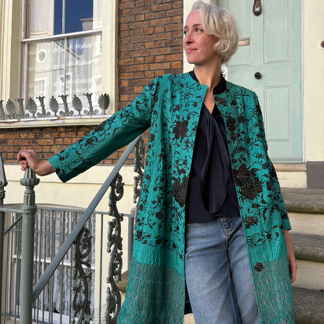 A vintage piano shawl has been reinvented into a fabulous evening coat. A show-stopping piece, perfect for occasion-wear but equally easy to wear with your go-to jeans and shirt for a more relaxed look. Note the black floral embroidery against the sea green silk.