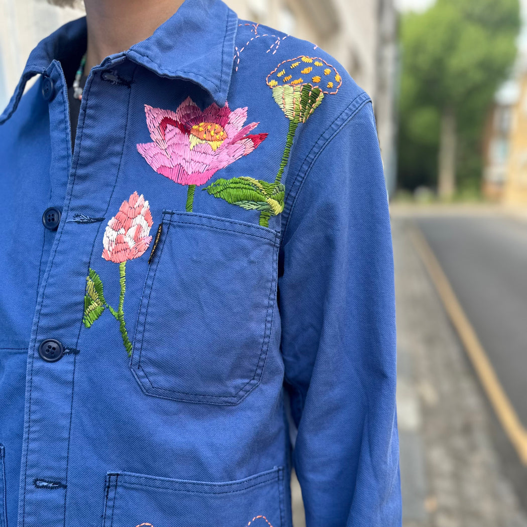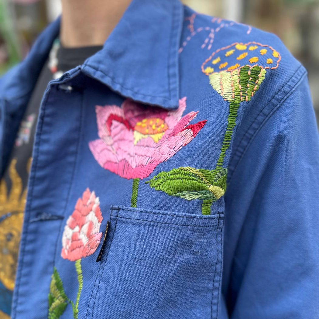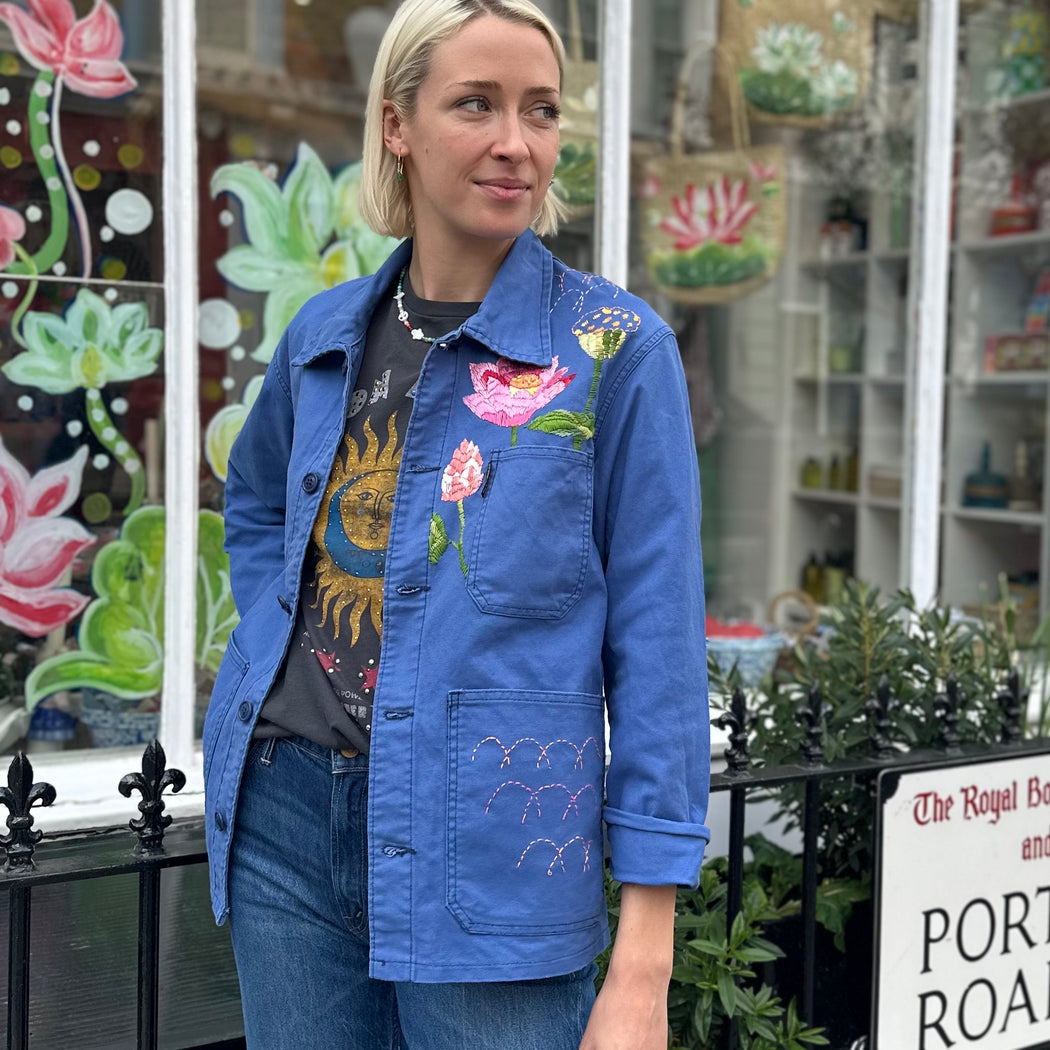 These vintage work wear jackets were unearthed in a beautiful vintage store in the Marais in Paris on our recent fashion week trip. Shirley has worked her magic on the vintage piece with her incredible embroidery.