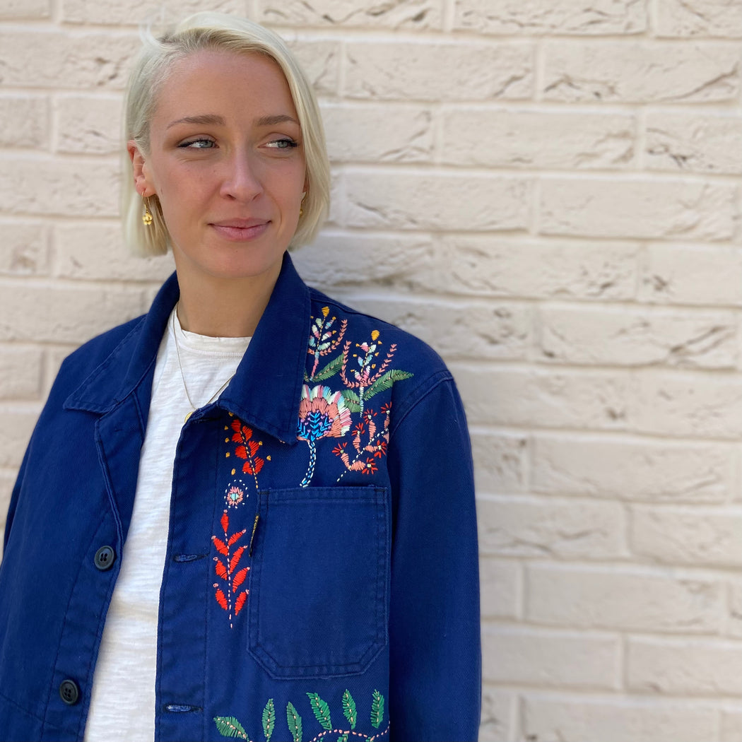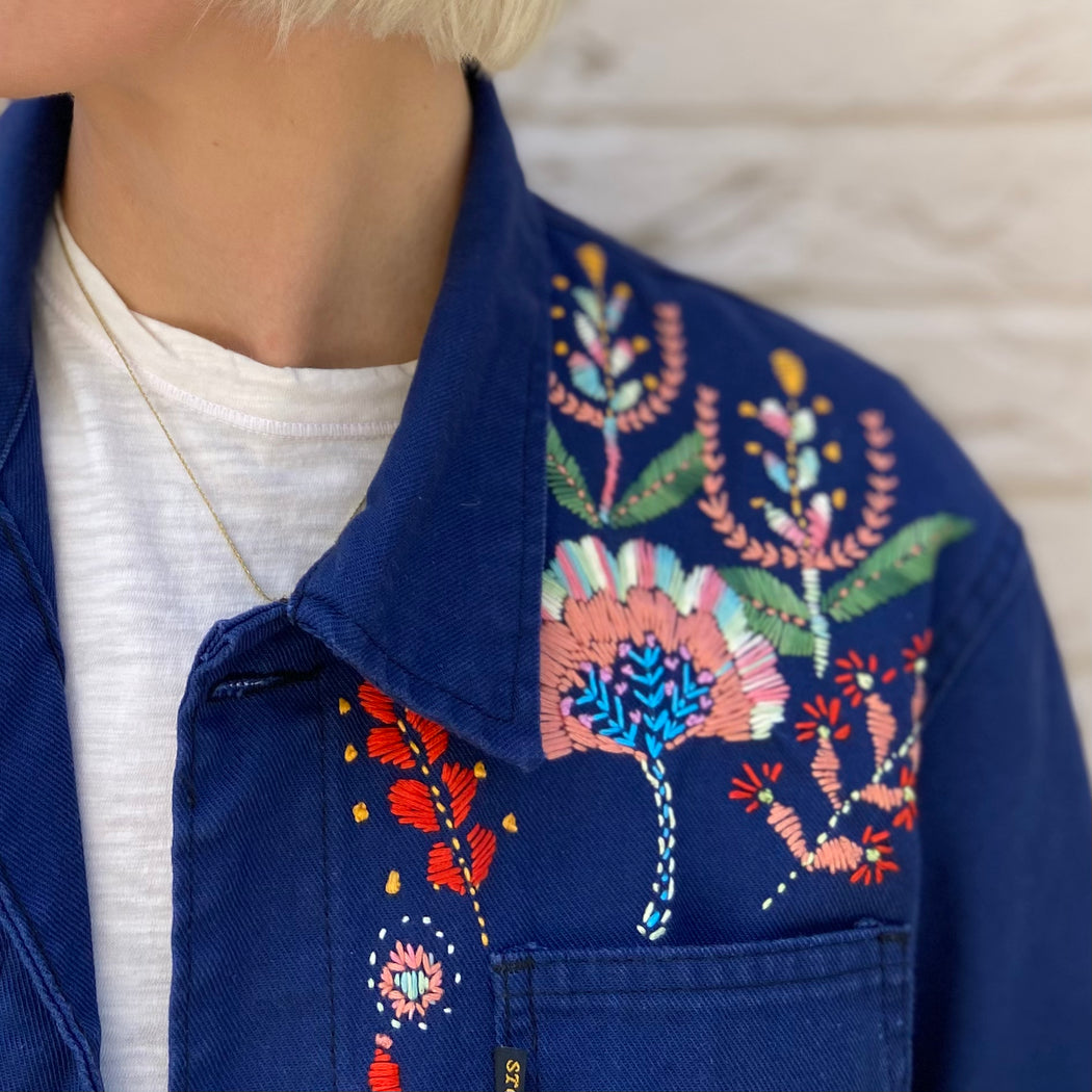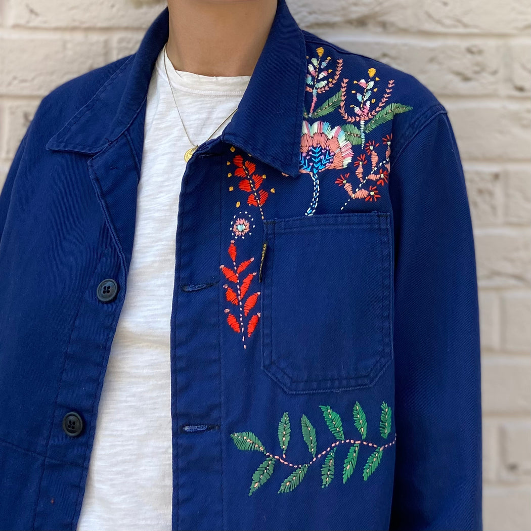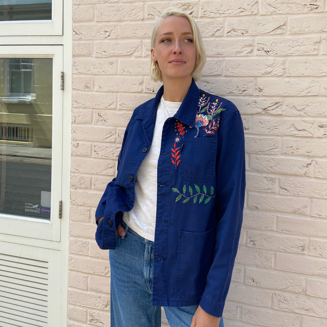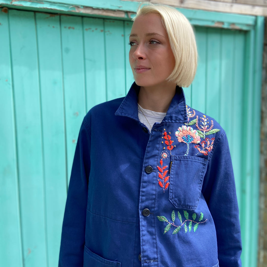 These vintage work wear jackets were unearthed in a beautiful vintage store in the Marais in Paris on our recent fashion week trip. Shirley has worked her magic on the vintage piece with her incredible embroidery.