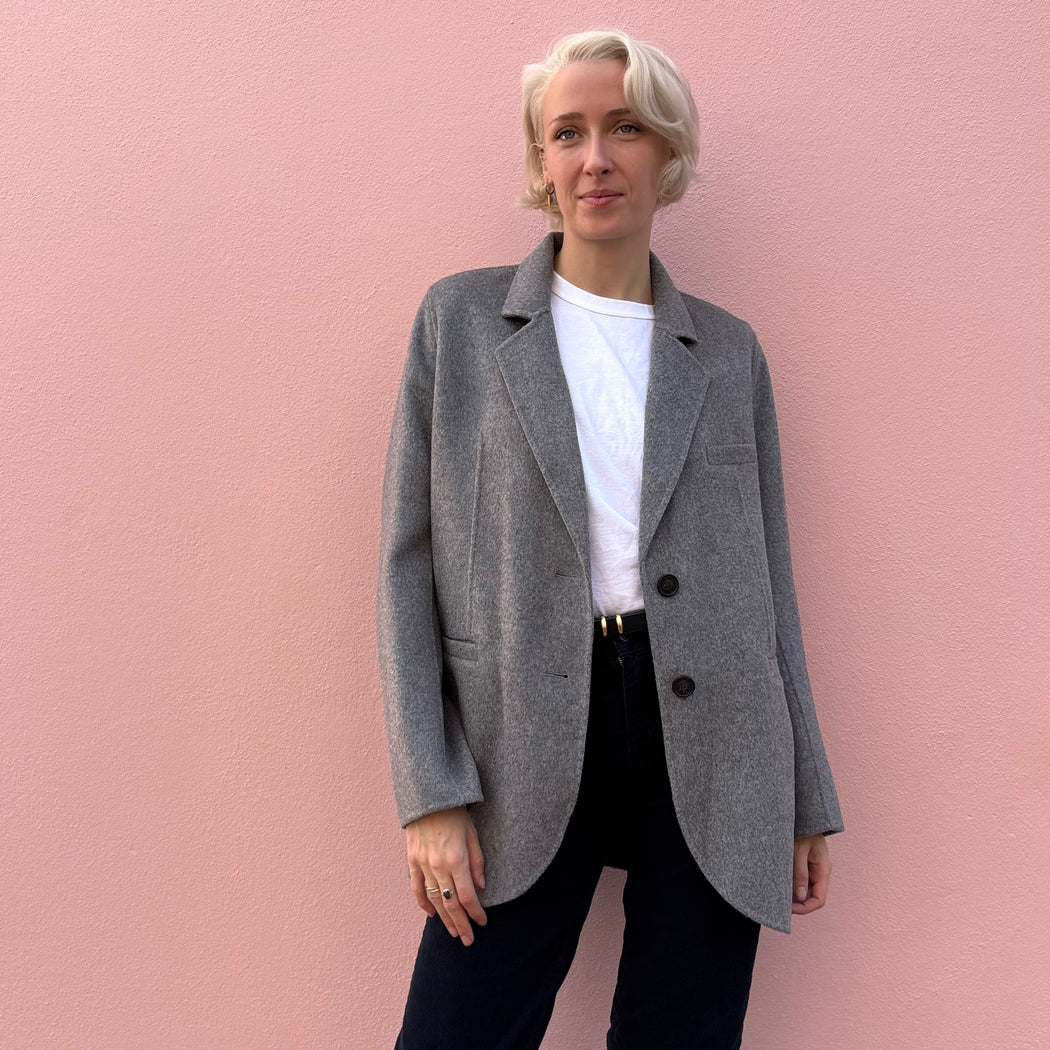 A winter staple - this boyish, soft grey, slightly oversized jacket is perfect alternative to your winter coat. It has long sleeves and a tailor collar, with two button fastening and pockets.