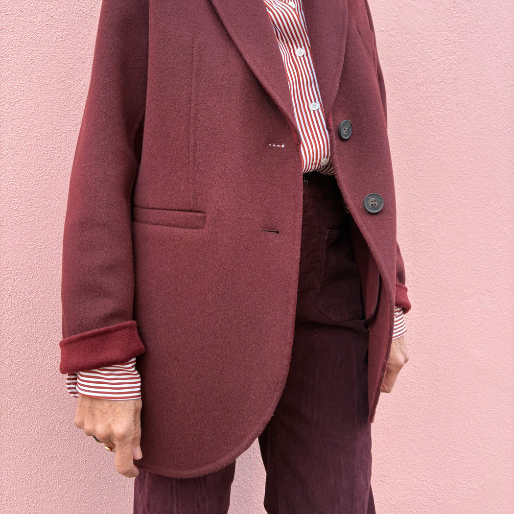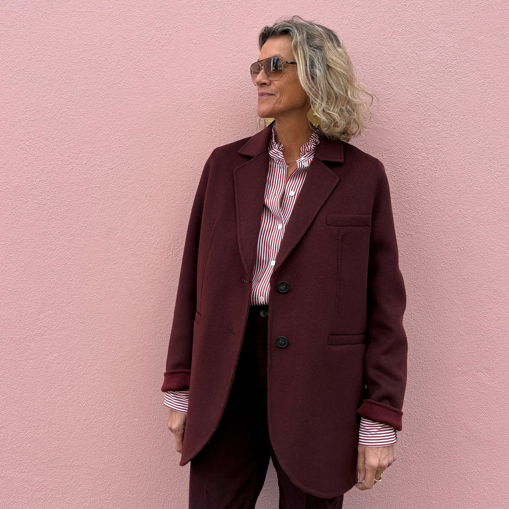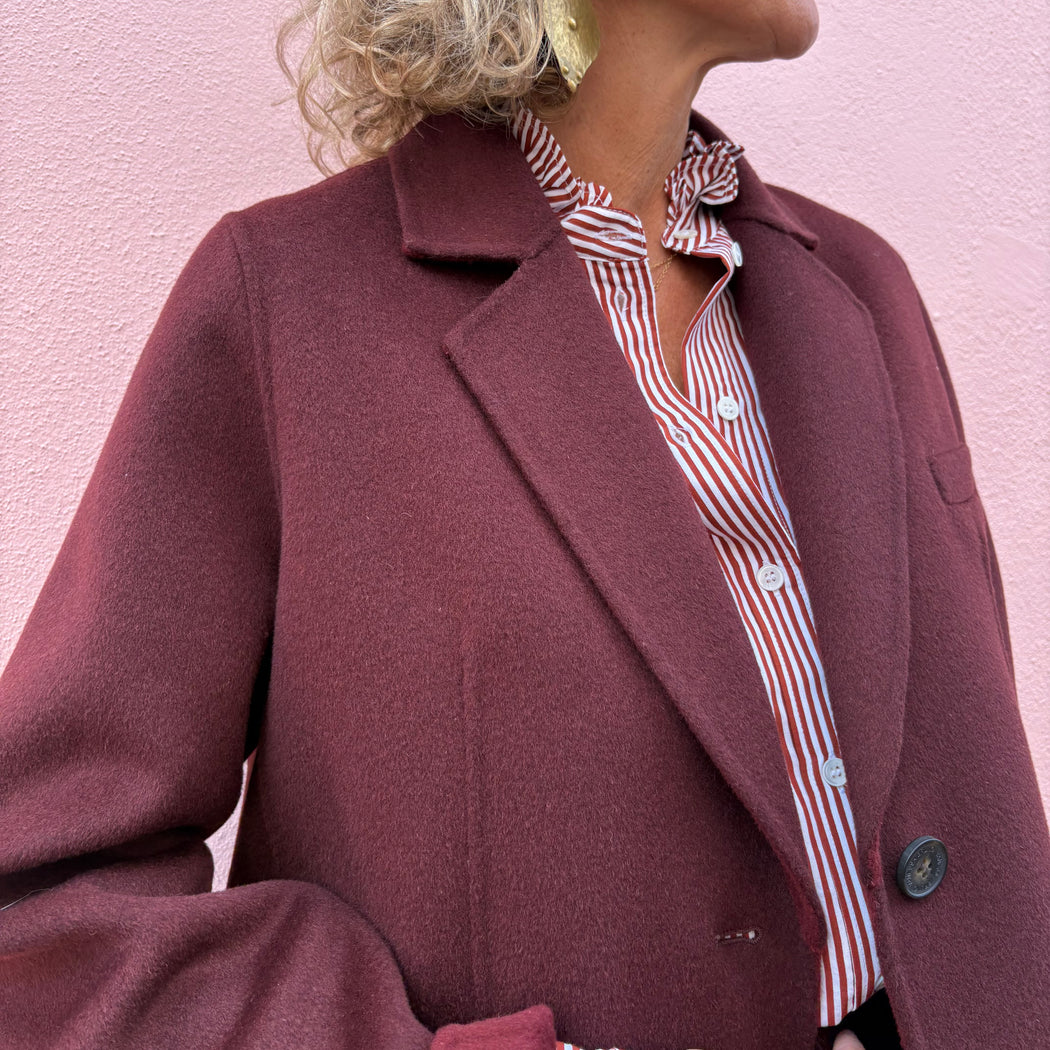 A winter staple - this boyish, maroon, slightly oversized jacket is perfect alternative to your winter coat. It has long sleeves and a tailor collar, with two button fastening and roomy pockets. Model wears a size 34.