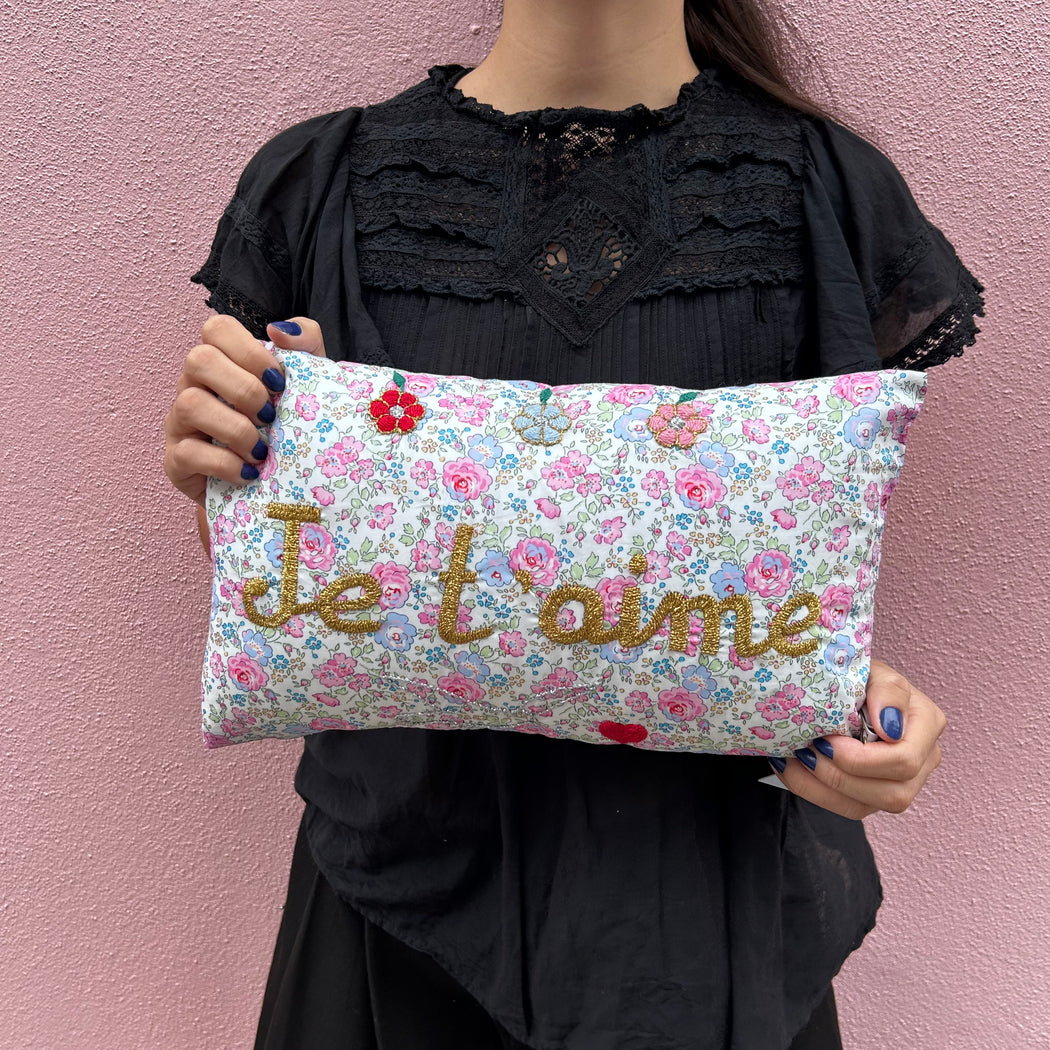 CSAO Je Taime Blue and Pink Floral Mini Cushion