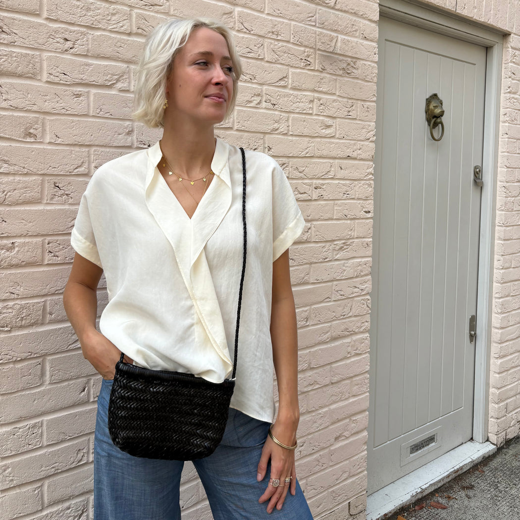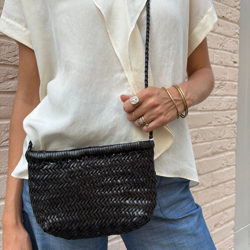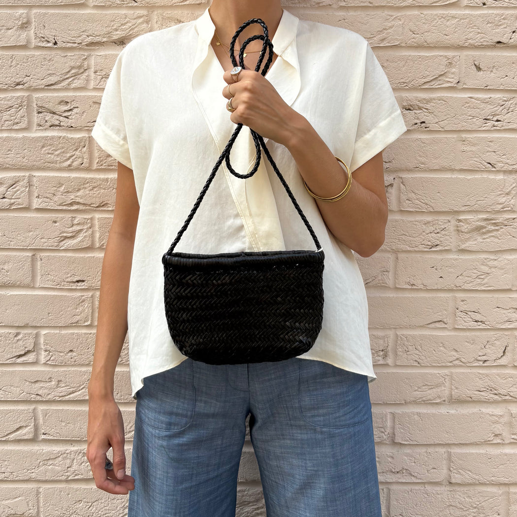 The Minsu Bag is a miniature version of a traditional basket, offering the same practicality and convenience. Its shoulder strap allows you to carry it with ease wherever you go. For added security, we have added a closure with two leather straps to keep your belongings safe and sound. The shoulder strap is not removable but can easily be hidden inside the bag.