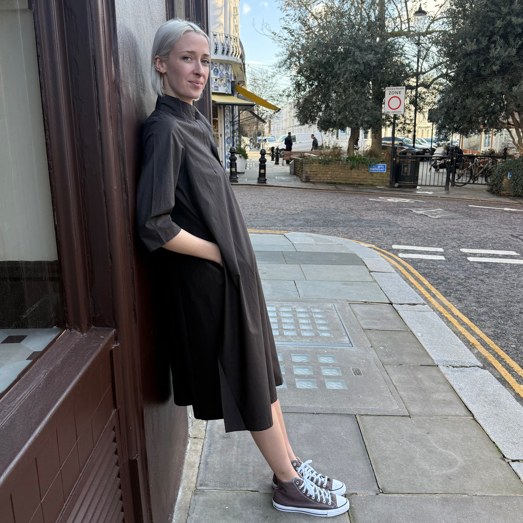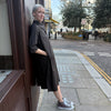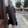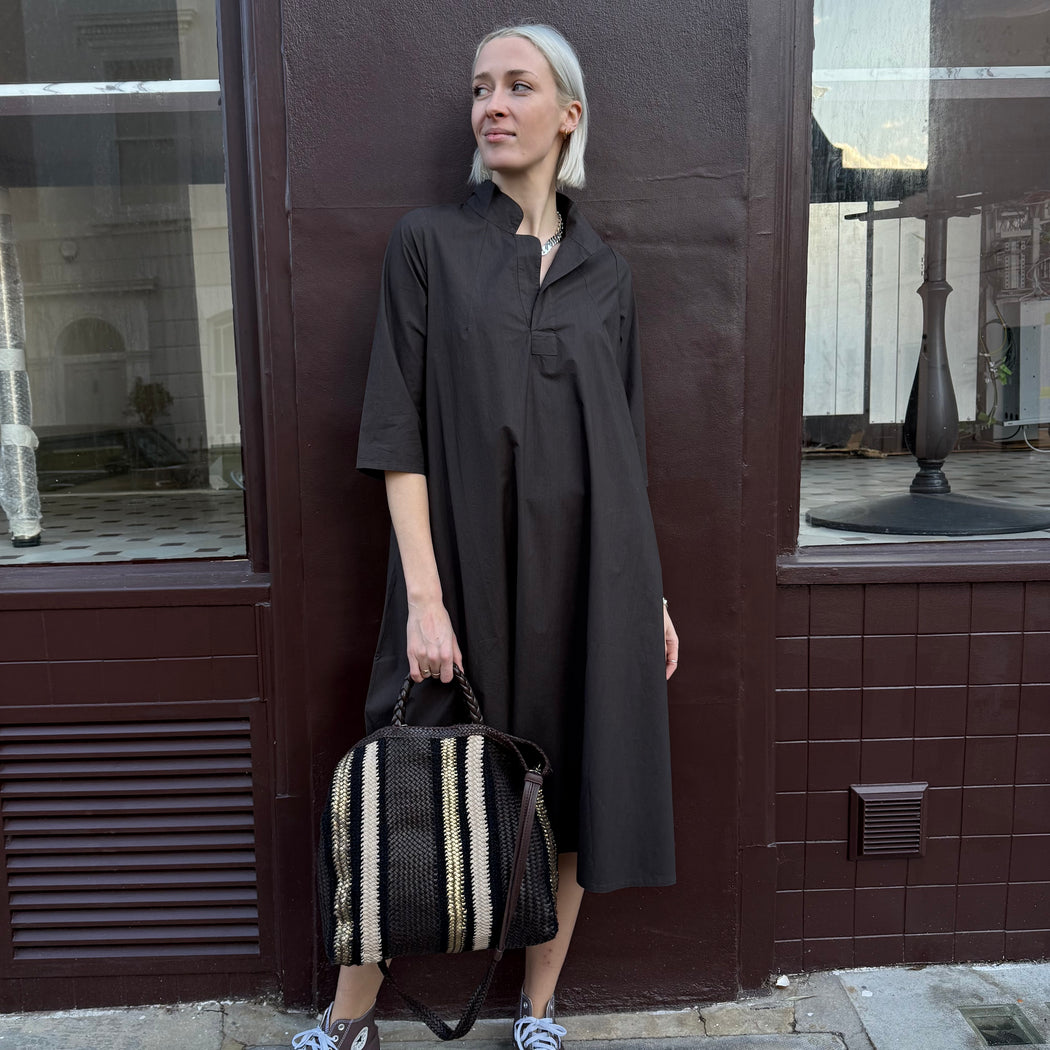 A simplistic relaxed cotton dress, ideal for hot summers. Elbow length sleeves and a mandarin collar with an open neckline, fishing mid length.