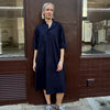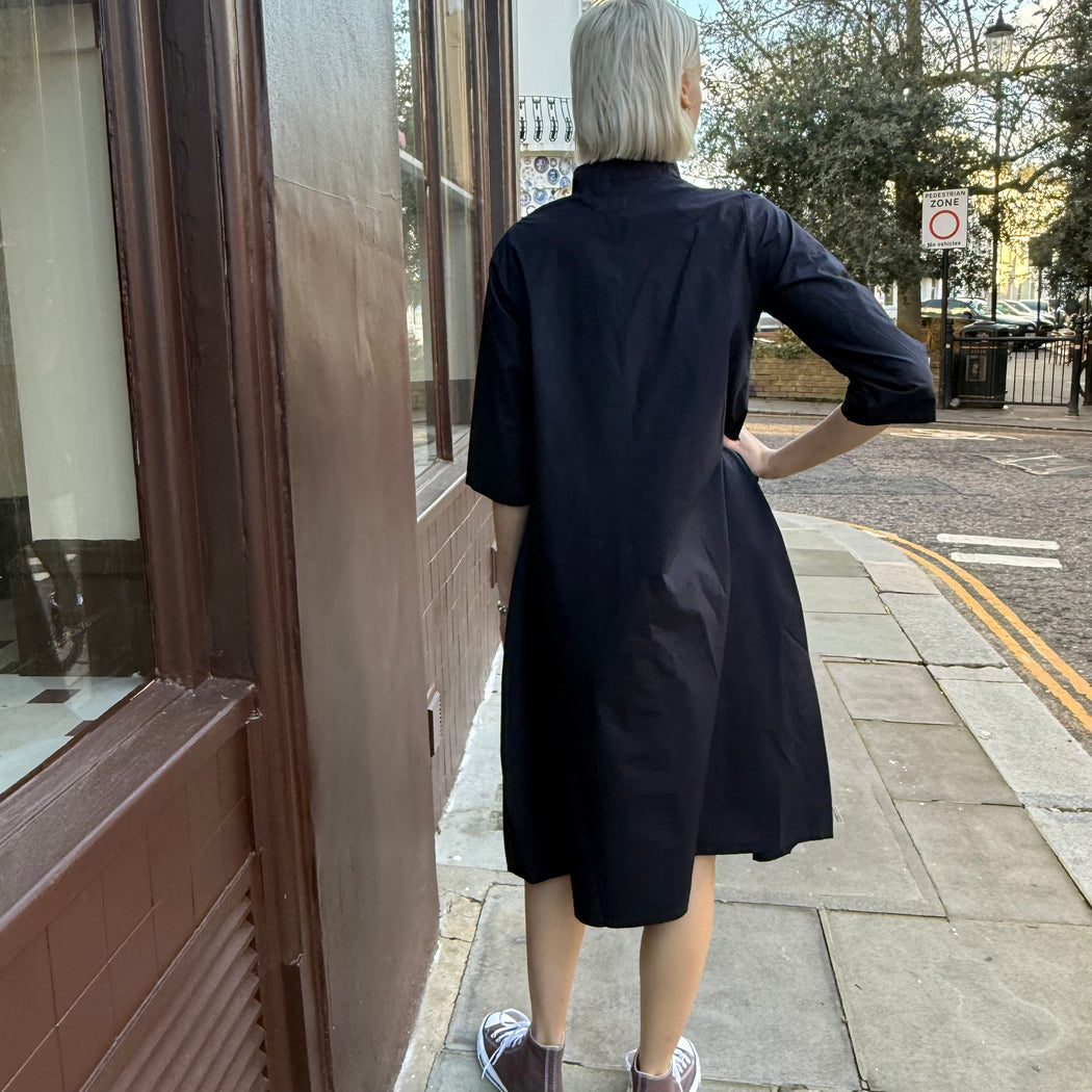 A simplistic relaxed cotton dress, ideal for hot summers. Elbow length sleeves and a mandarin collar with an open neckline, fishing mid length.