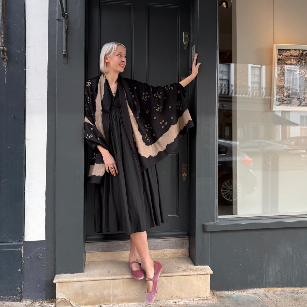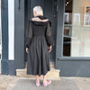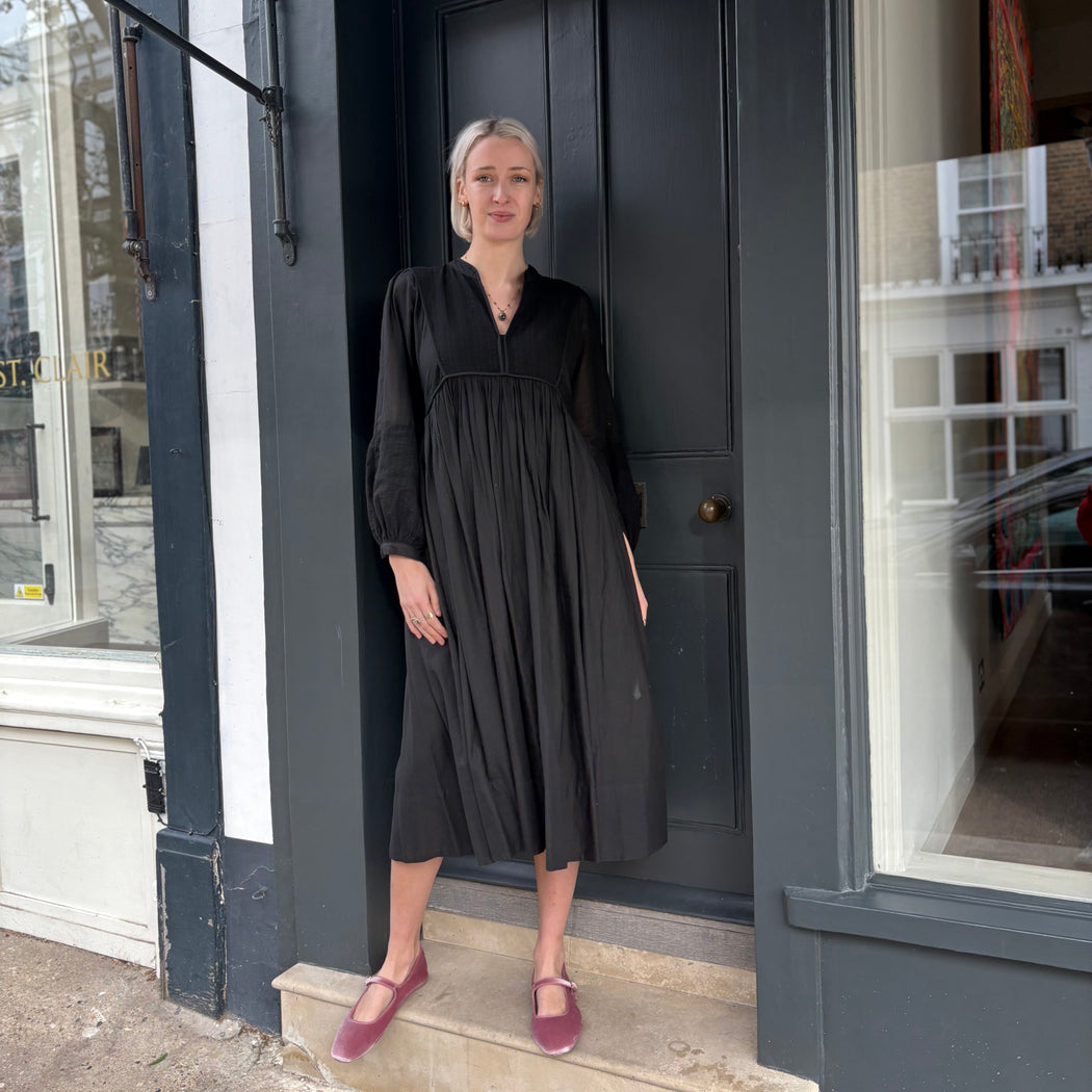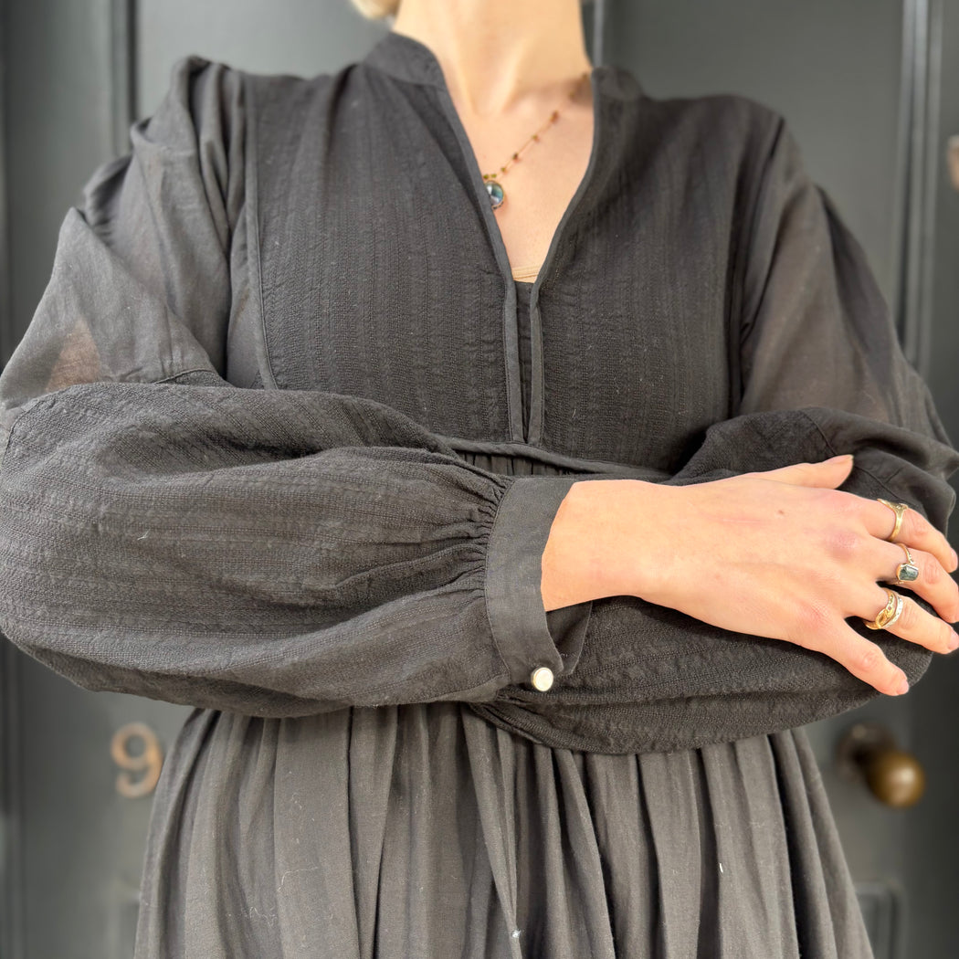 Long sleeve black cotton dress with contrasting textures. A flowing skirt, finsihed with a flat collar.