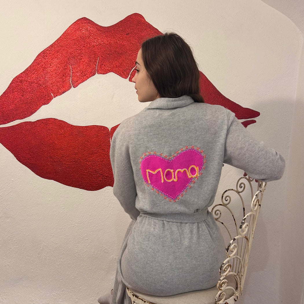 The Cross Cashmere Mama Embroidered Dressing Gown in in Super Grey