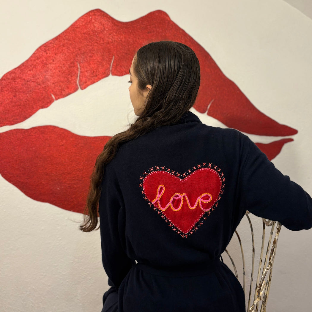 The Cross Cashmere Love Embroidered Navy and Red Heart Dressing Gown