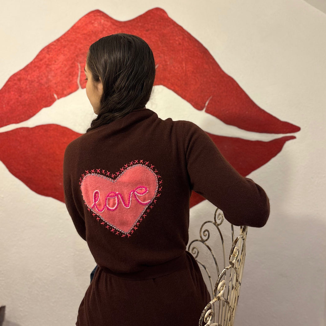 The Cross Cashmere Embroidered Love Coral Heart Dressing Gown in Cocoa My cart