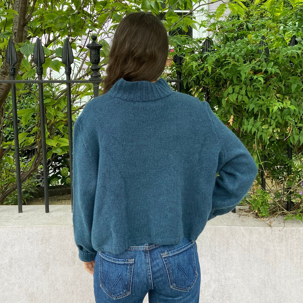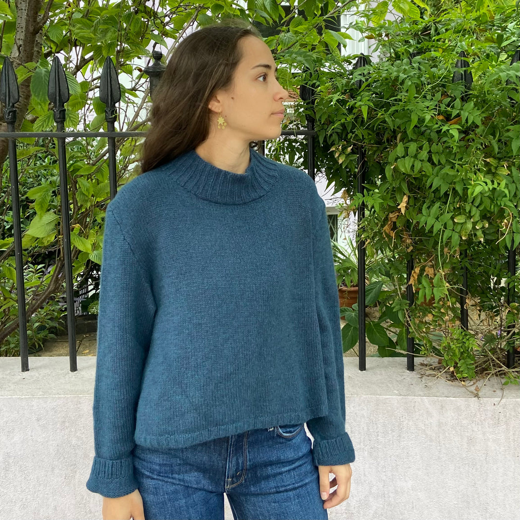 One-size only, designed to be oversized and slouchy, with a high collar that is not swamping. Once owned, it becomes your go-to jumper.