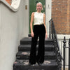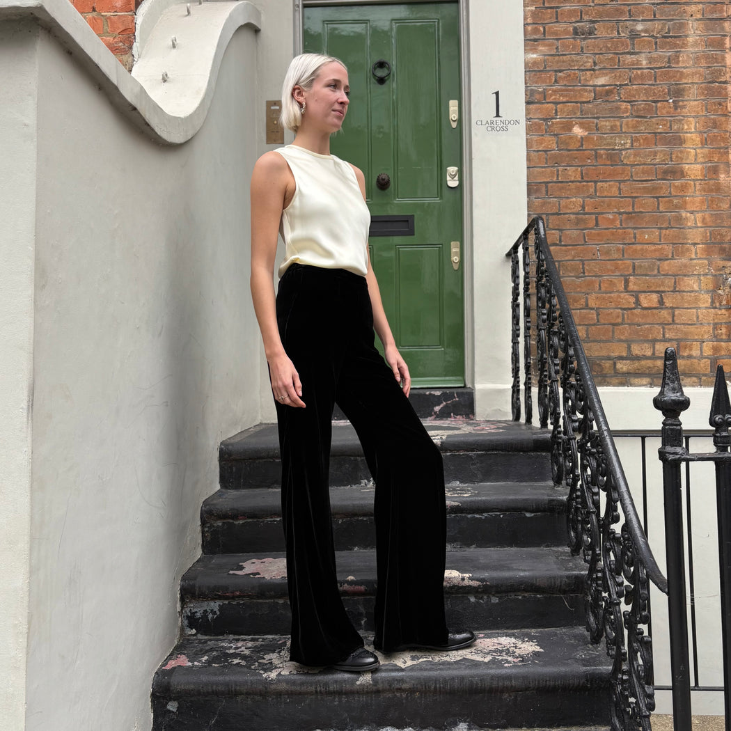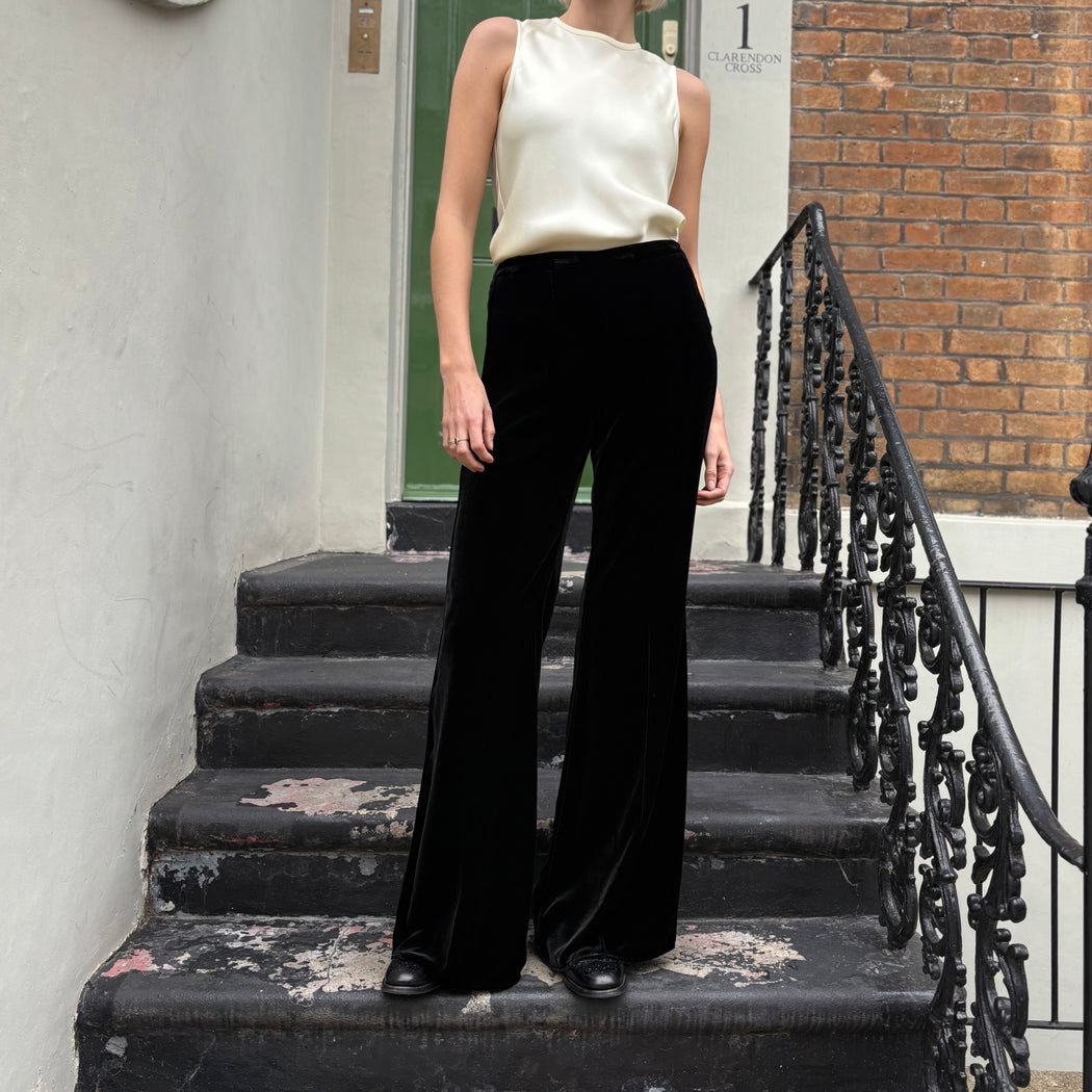 A soft plush velvet, these flared trousers flatter the figure with their sleek silhouette and feminine flair. Featuring an elastic at the back of the waist and side–zip fastening are a guarantee for comfort.