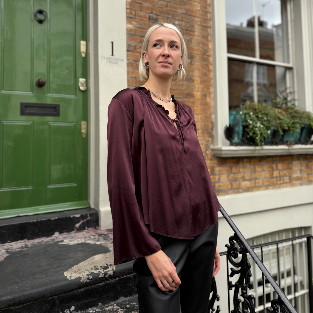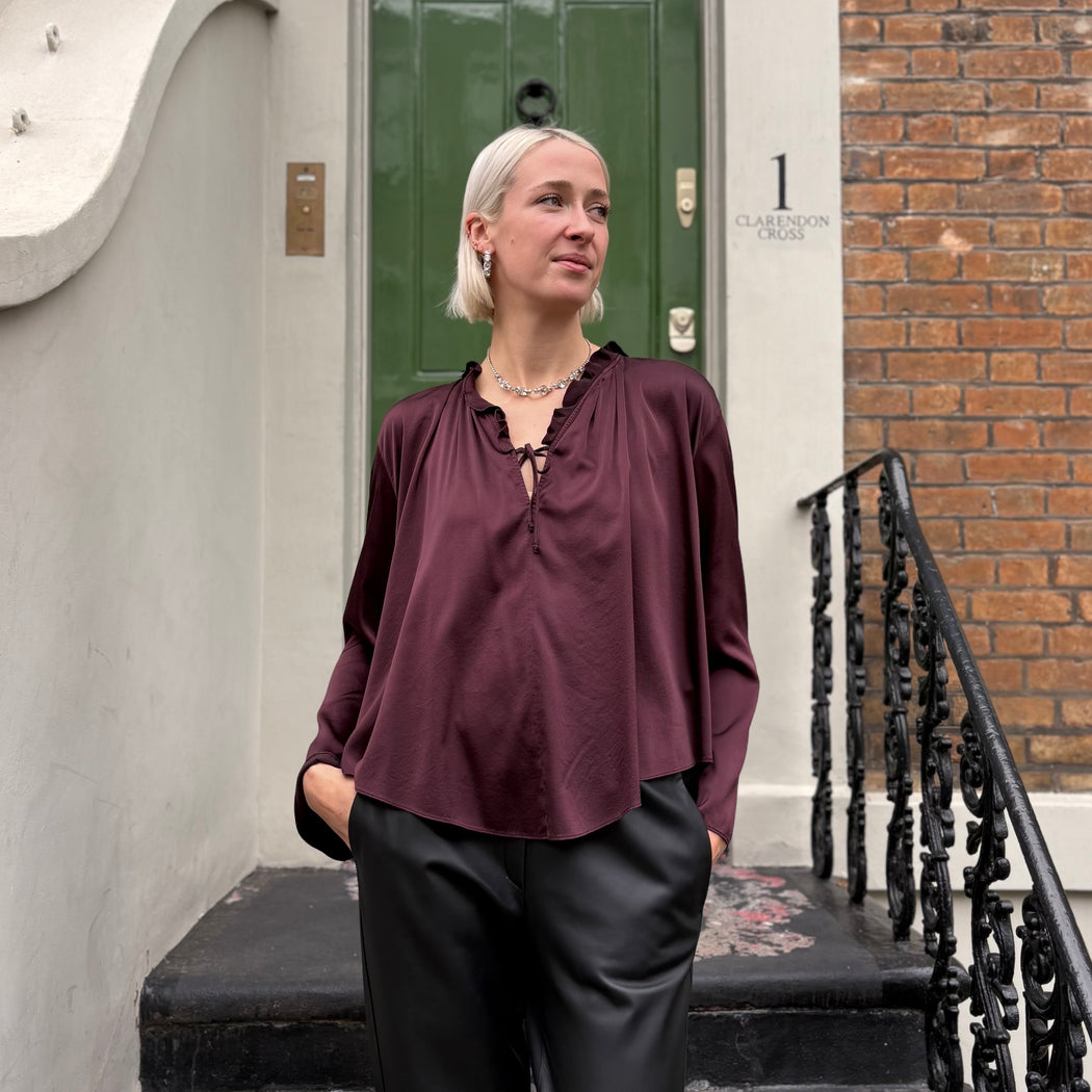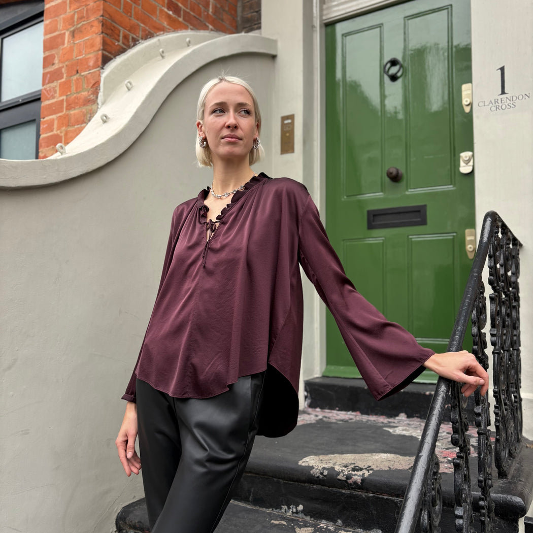 An ethereal piece, exaggerated wide sleeves. An oversized drapped fit to the body with delicate ruffles framing the neckline. The back of this top is slightly longer than the front.