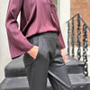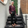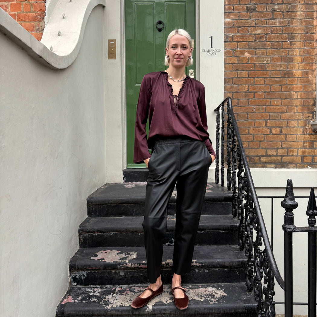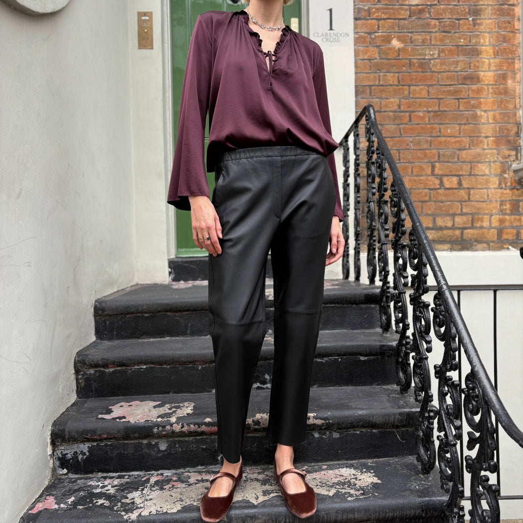 A slim cut leather jogger pant in deliciously supple leather. They have an elasticated waist with a faux fly and boyish french pockets. Teamed here with a typical Forte Forte ethereal voile shirt, contrasting and softening the bold leather look.