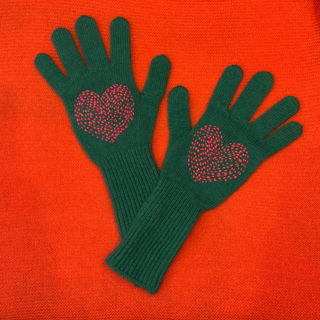 Exclusively Cross: Heart Embroidered Green Cashmere Gloves