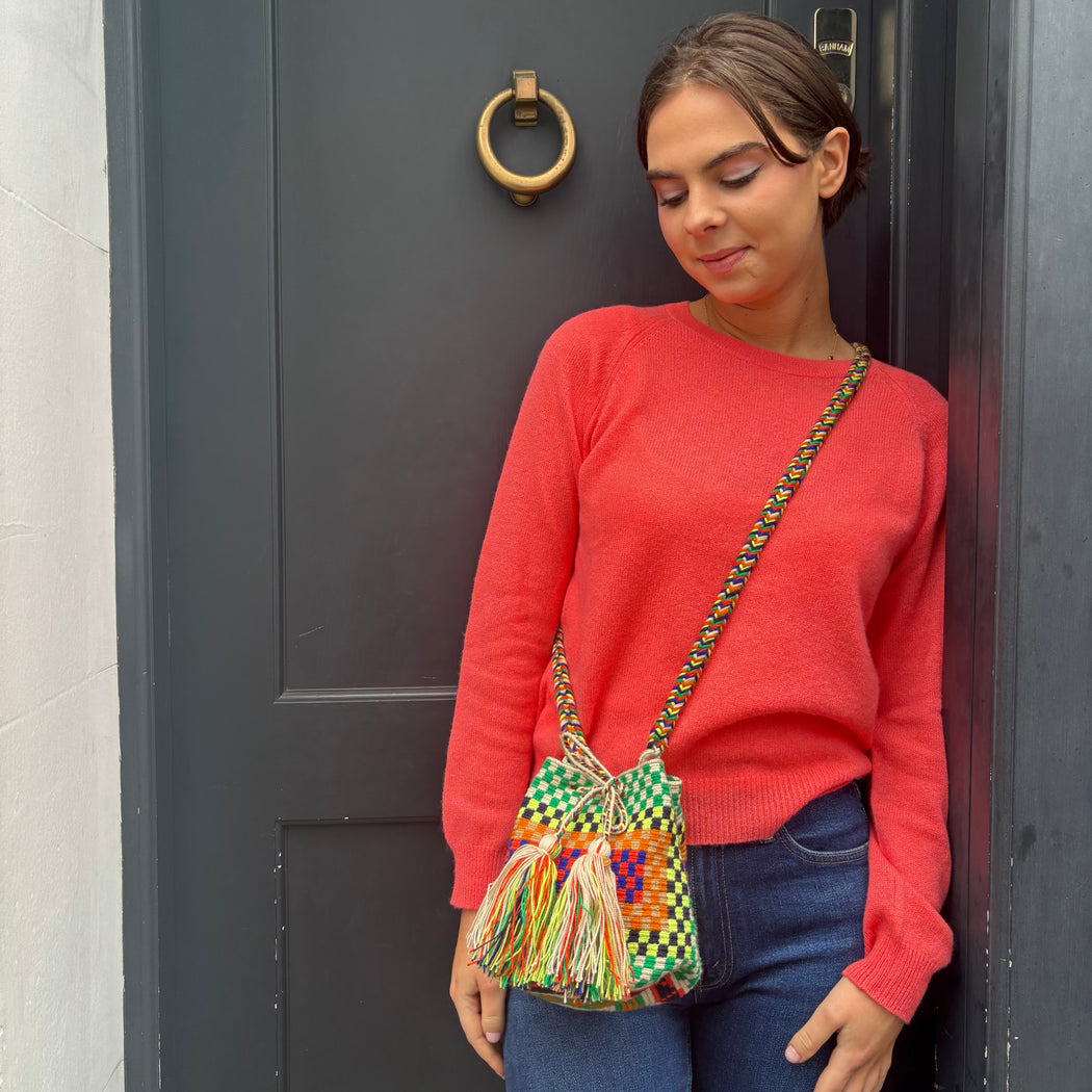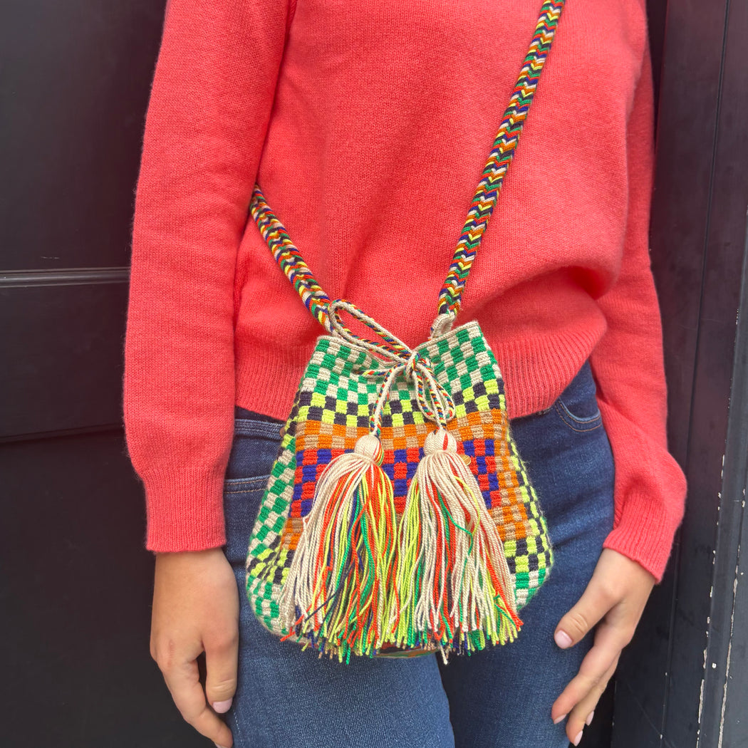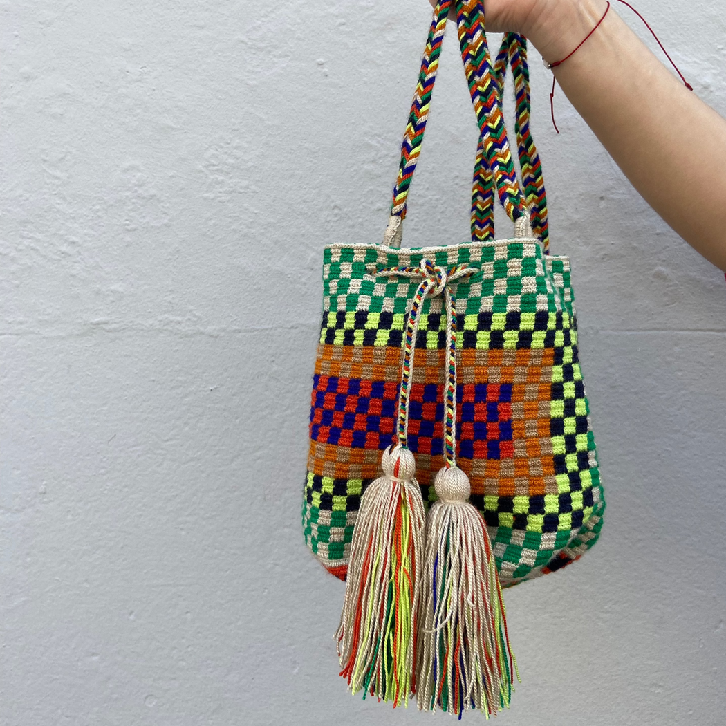 Every bag is handmade with a uniqueness, each collection lets us travel through a sea of colours, patterns and shapes. Guanabana wants to tell new stories through weaving in Colombia, designing in Madrid and hand made by Wayuu artisans who crochet and make our hand bag dreams a reality! Finished with two pompoms and a bronze medal with the words BE POSITIVE. Exactly what we like to hear!