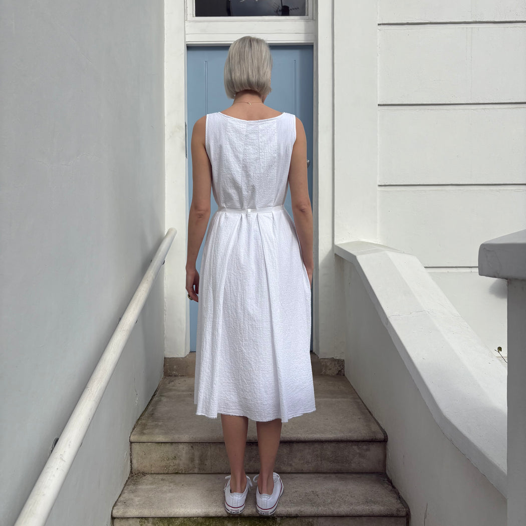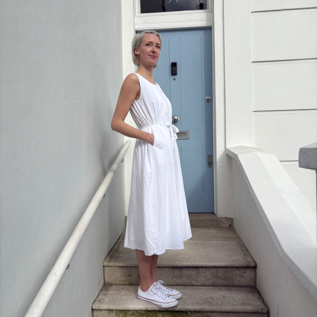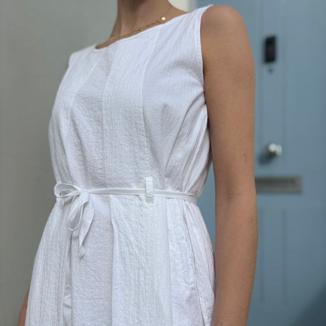 A high summer dress, crinkled white cotton a relaxed sleeveless shape with a tie at the waist.