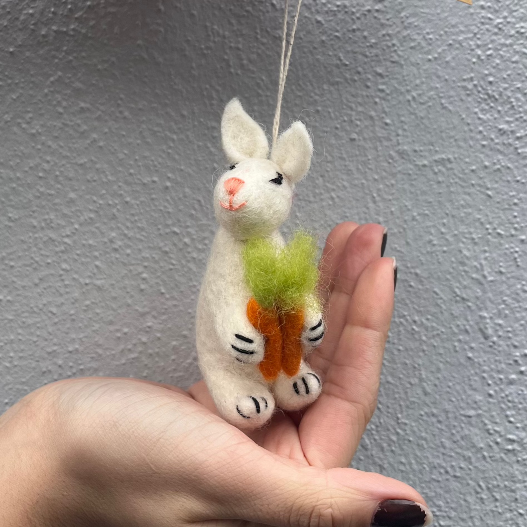 This lovely bunny is made from hand felted wool. It comes with a cotton string loop to hang or attach to a present.
