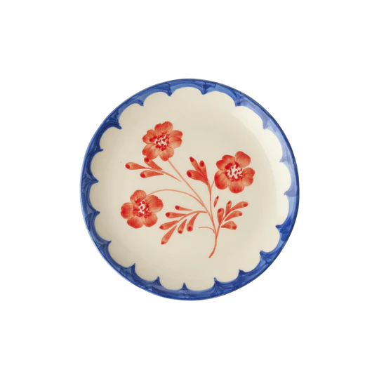 Set a lovely cake table with this beautiful ceramic cake plate. It is hand-painted with a delicate blue scallop around the rim and red flowers in the centre. Each plate is hand-painted by a group of amazing Portuguese women, making every single plate truly unique. We think it’s so charming.