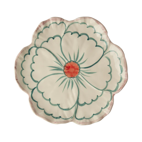 Set a lovely cake table with this beautiful ceramic cake plate. It is hand-painted with a delicate blue scallop around the rim and red flowers in the centre. Each plate is hand-painted by a group of amazing Portuguese women, making every single plate truly unique. We think it’s so charming.