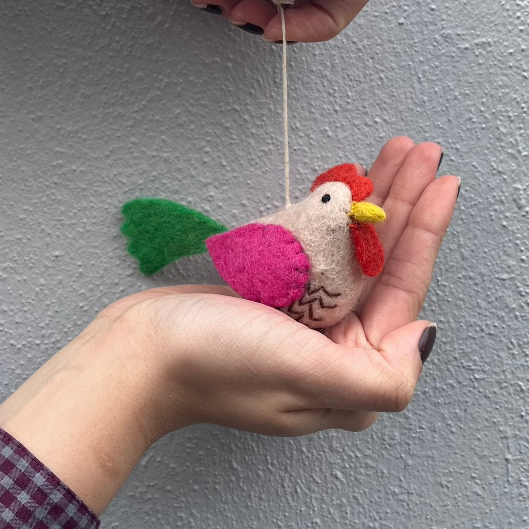 This lovely chicken is made from hand felted wool. It comes with a cotton string loop to hang or attach to a present.