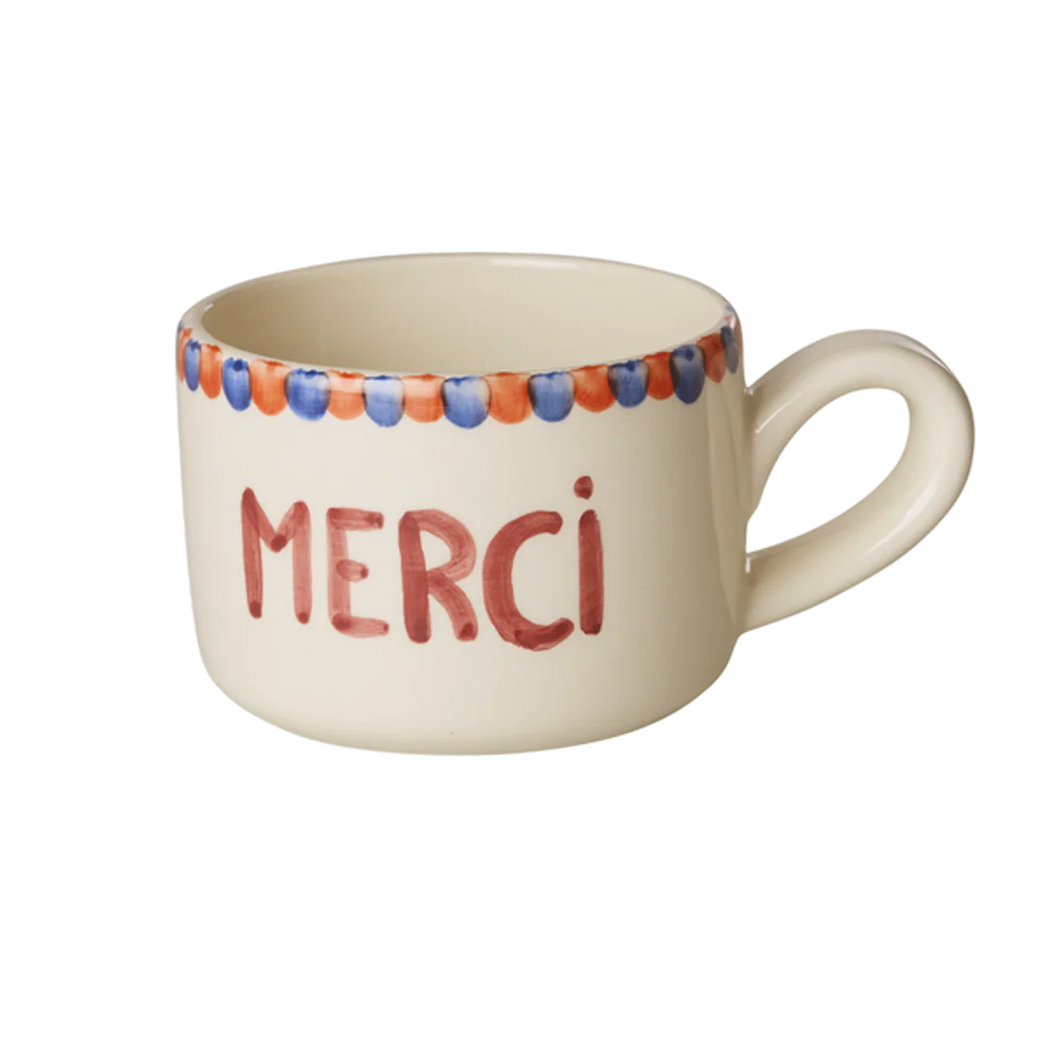 The loveliest cappuccino cup with cute dots on the rim and the word "merci" written in the center. The cup is as unique as you are. It is hand-painted by a group of amazing Portuguese women, making each cup truly unique. We think it’s so charming!