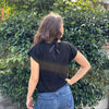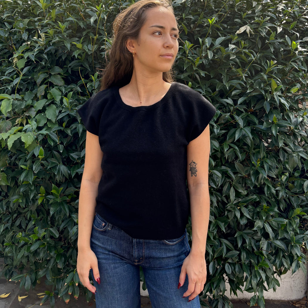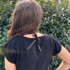 Cap sleeve black cashmere crew neck jumper with ribbon tie detail. Great for evenings, great layered over a t shirt. True to size.