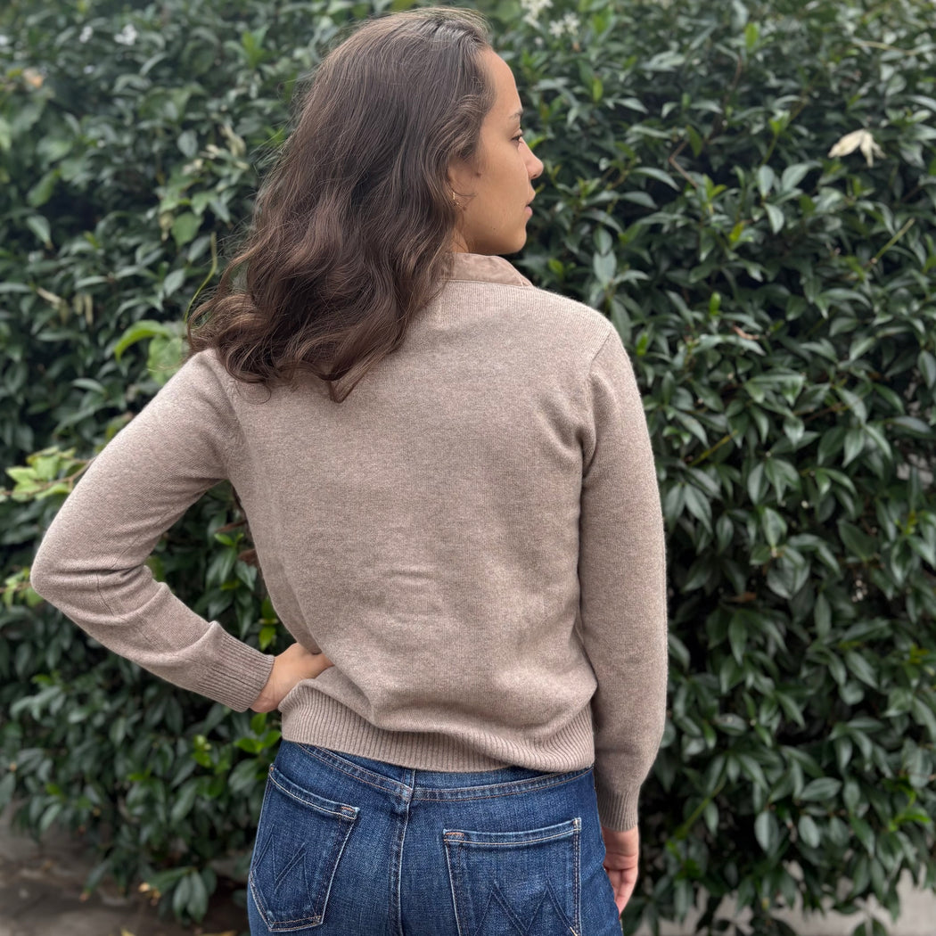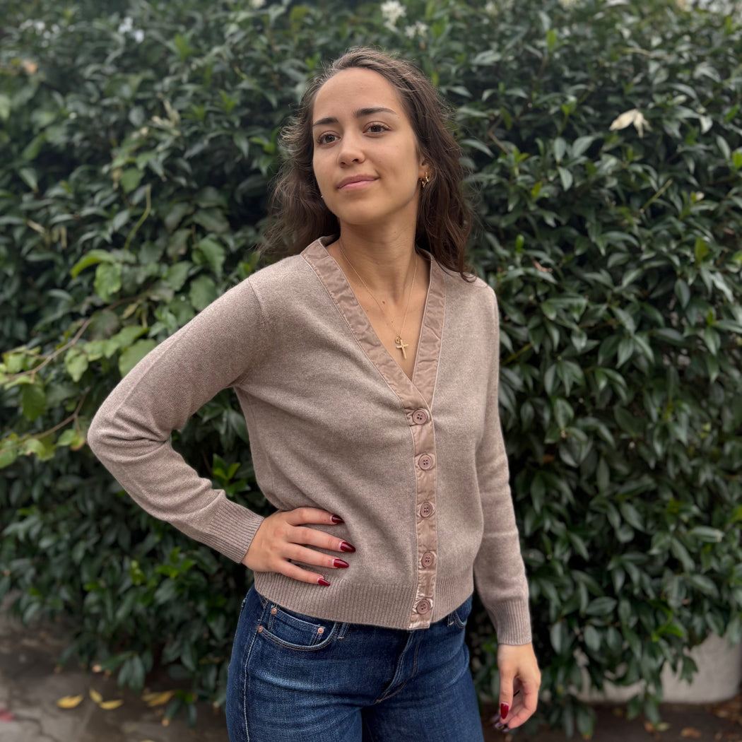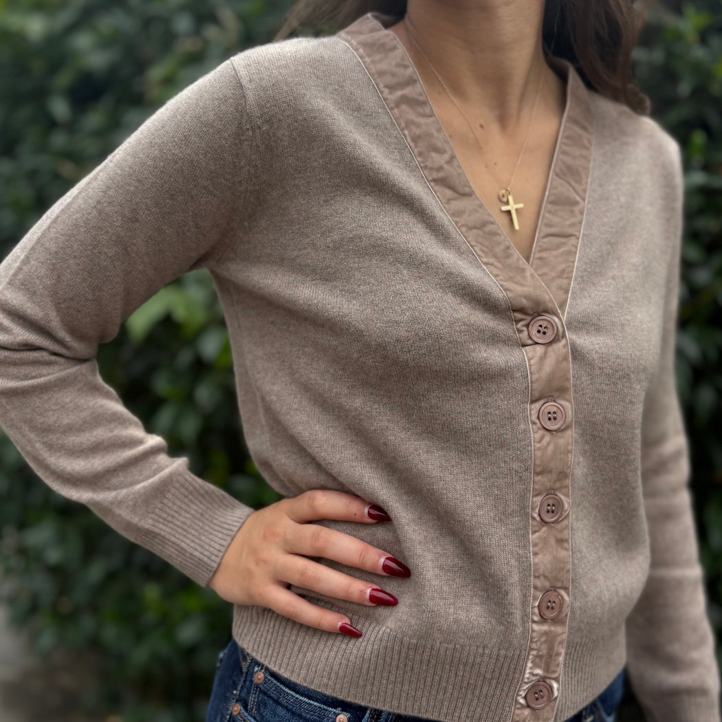 Organic brown vee neck cardigan crafted in a cashmere and wool blend with matching velvet trim.