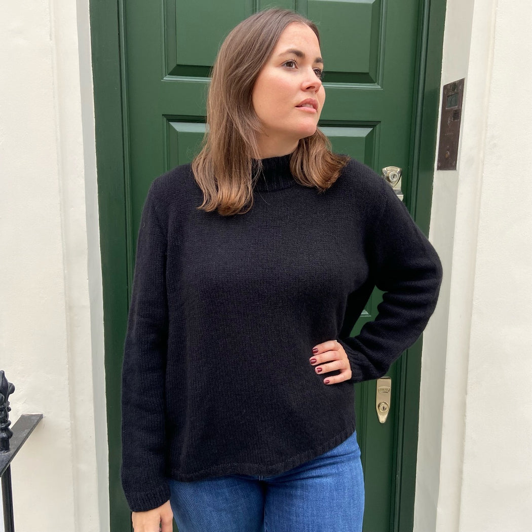 One-size only, designed to be oversized and slouchy, with a high collar that is not swamping. Once owned, it becomes your go-to jumper.