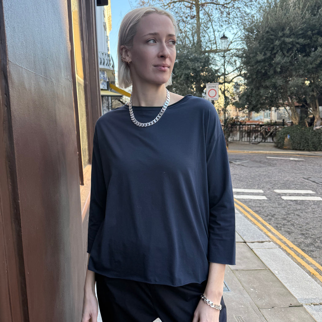 Soft jersey cotton in a dark navy shade, elbow length sleeves and a boat neckline.