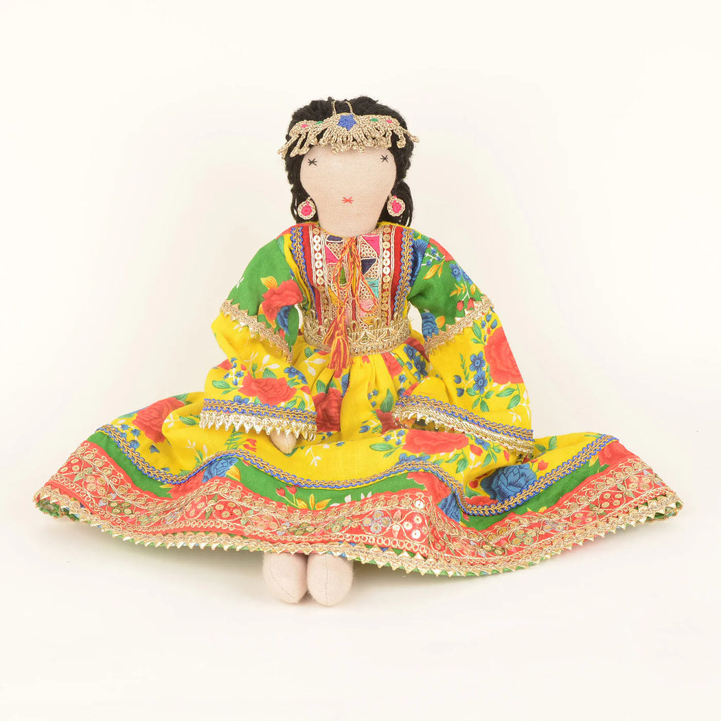 Nura embodies the essence of celebrating cultural heritage, adorned in the traditional Afghan dress worn during joyous festivities. Her jewellery, meticulously crafted with intricate zari work, symbolises artistry and beauty. Handcrafted by Afghan women refugees residing in India, Nura's creation reflects their resilience and creativity using discarded fabric, rekindling memories of happier times in their homeland. She is more than a mere doll; she stands as a beacon of hope, reminding us of the unwavering determination of Afghan women artisans to reclaim their lives despite conflict and displacement. Nura encapsulates their dreams for a brighter future filled with peace, stability, and the revival of their cultural heritage. She represents a tangible connection to their roots and a belief in the power of creativity to overcome adversity.