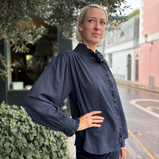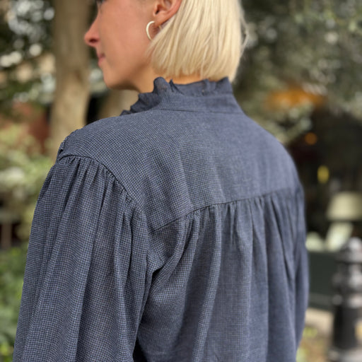 Maison Hotel Celeste Blue Mini Check Ruffle Shirt