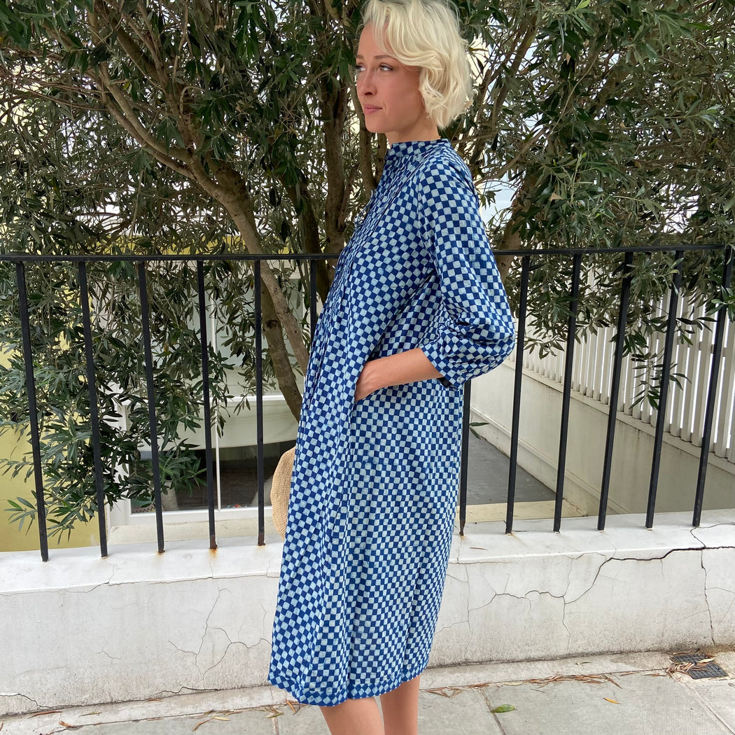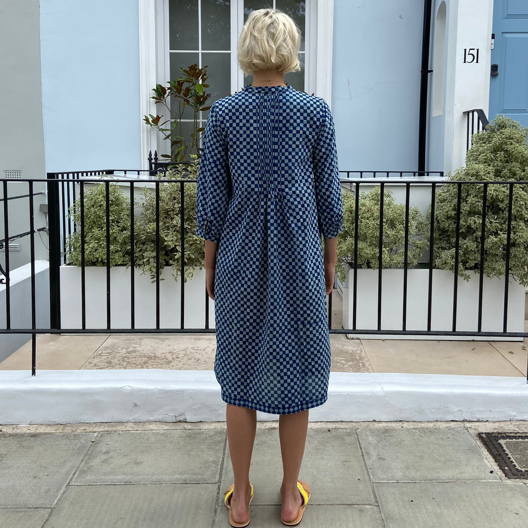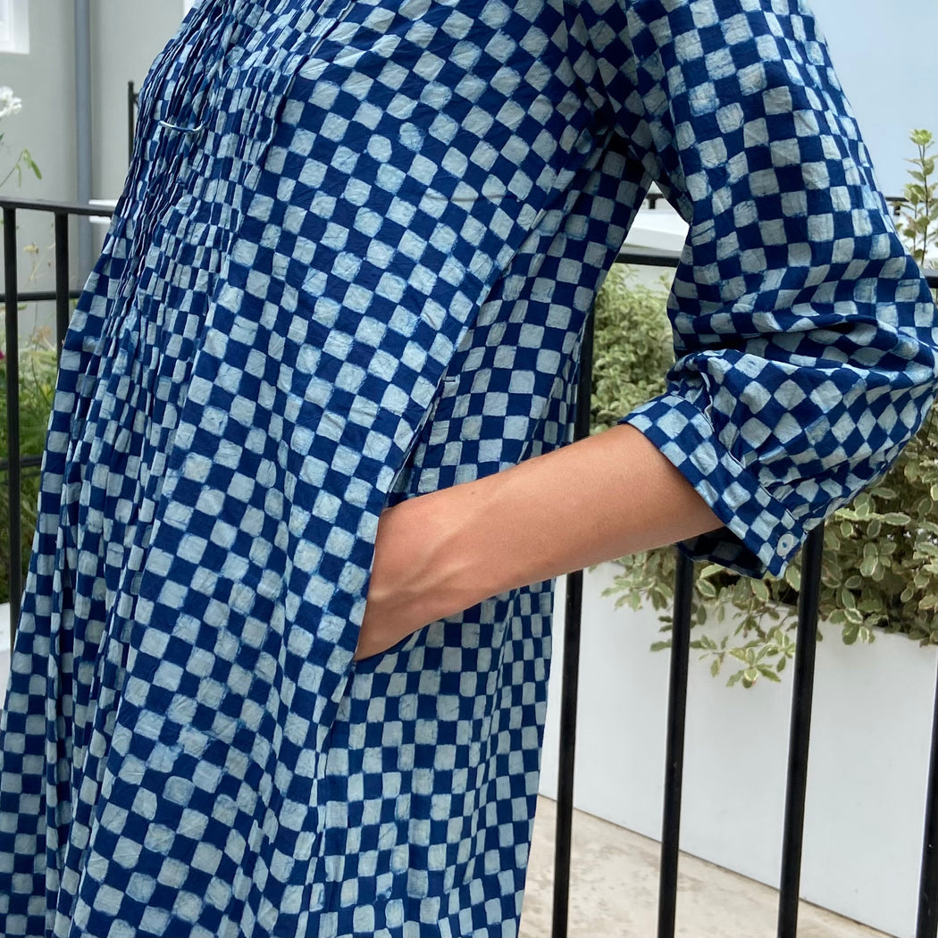 This holiday dress has a pleated front placket, ties at the neckline and side pockets. An original colour combination, in indigo checkerboard.