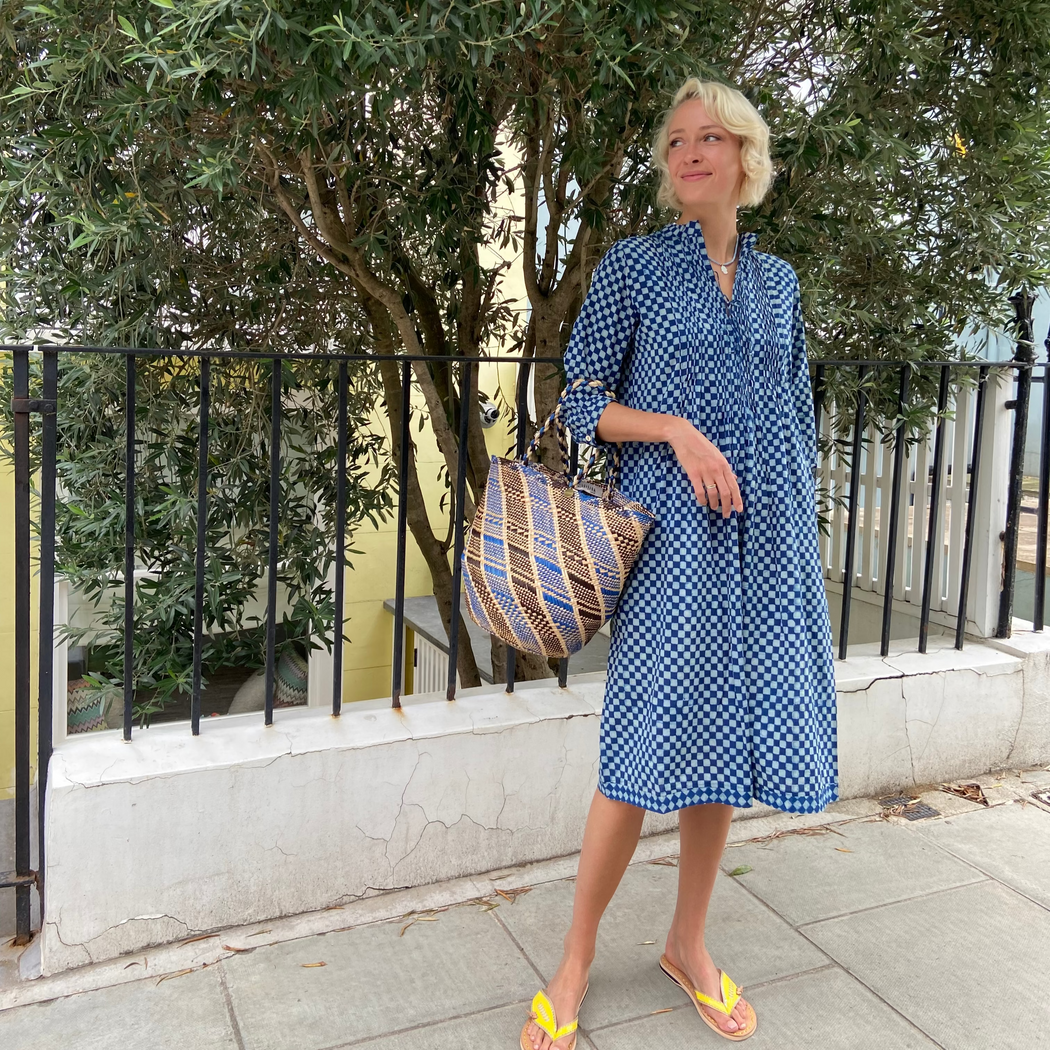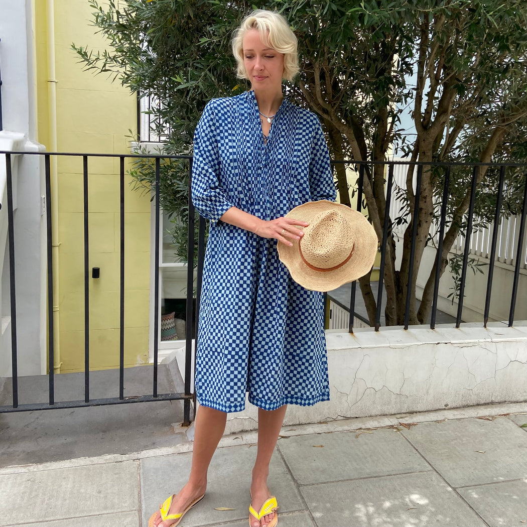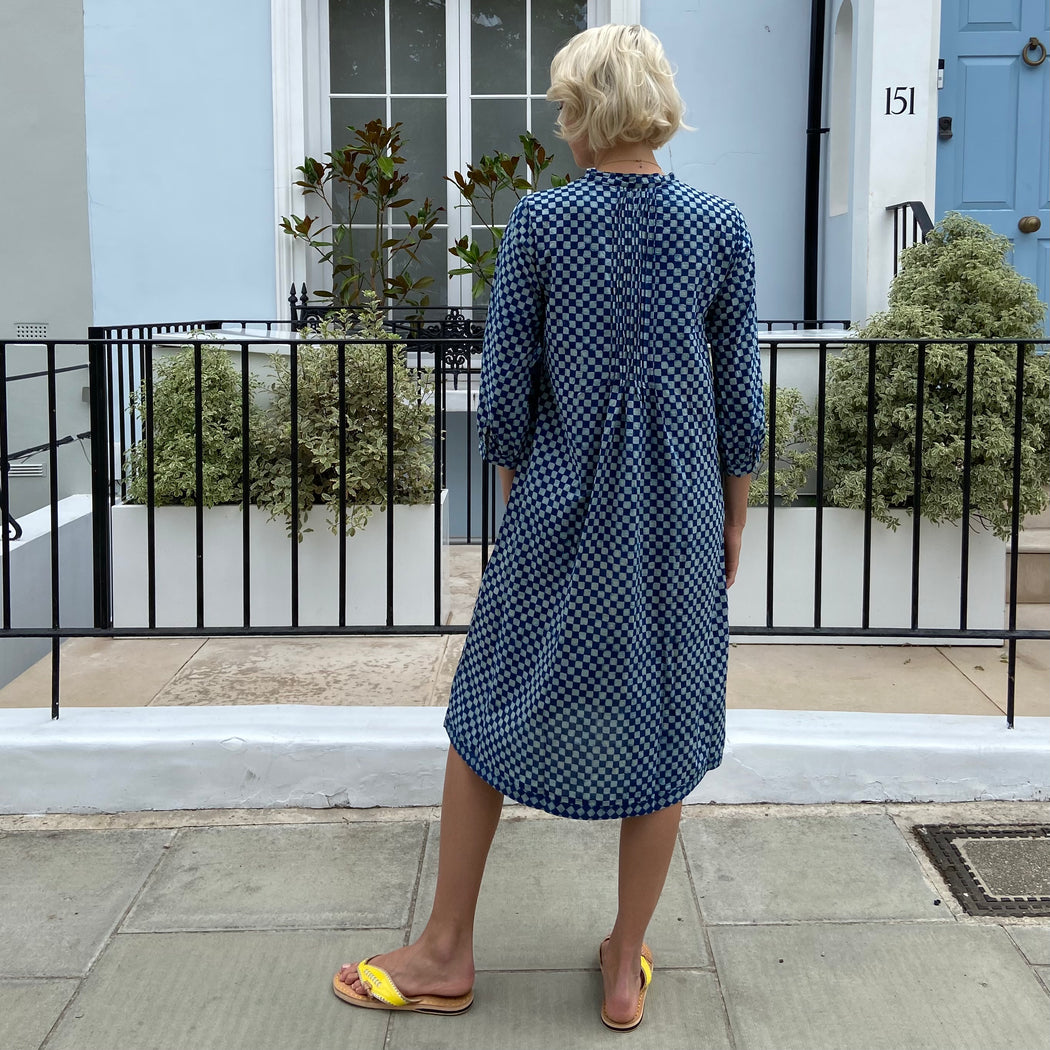 This holiday dress has a pleated front placket, ties at the neckline and side pockets. An original colour combination, in indigo checkerboard.