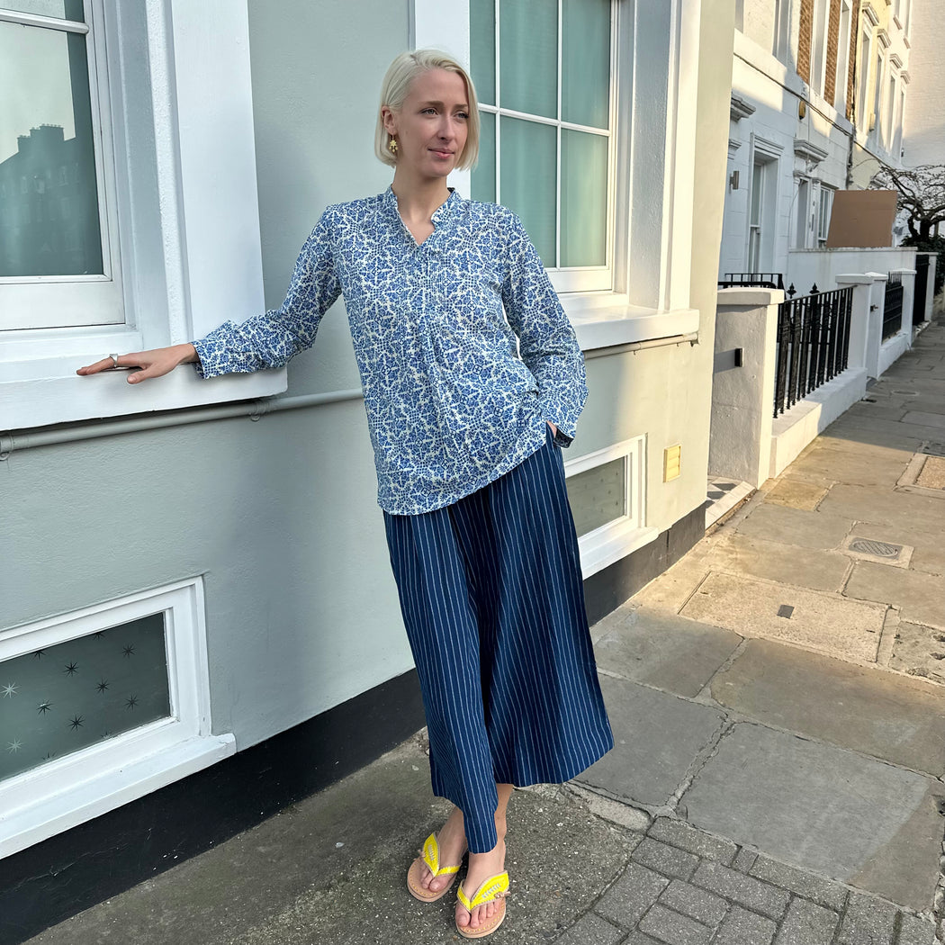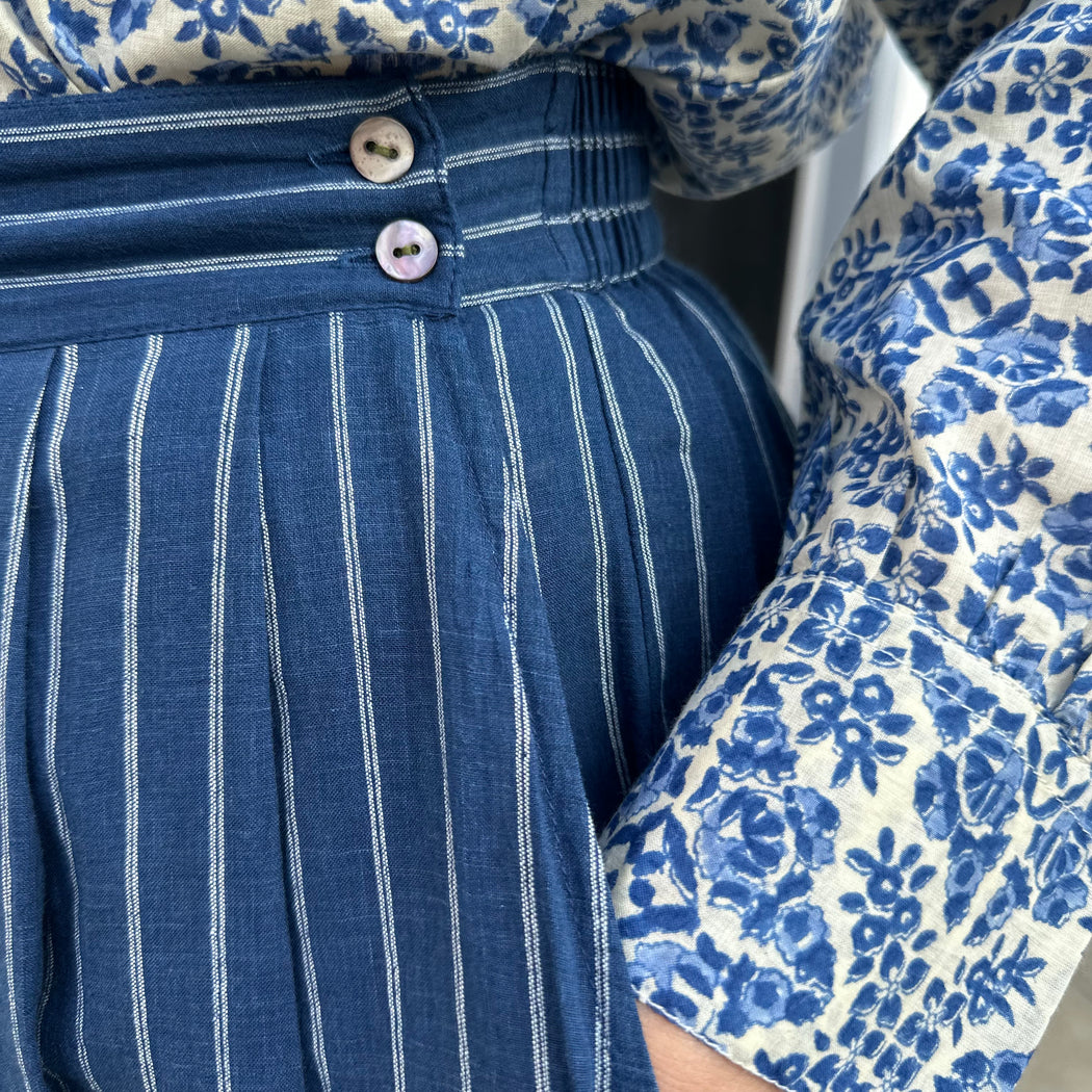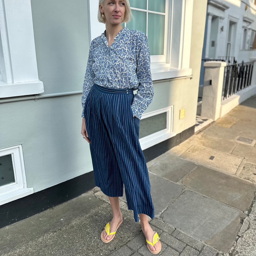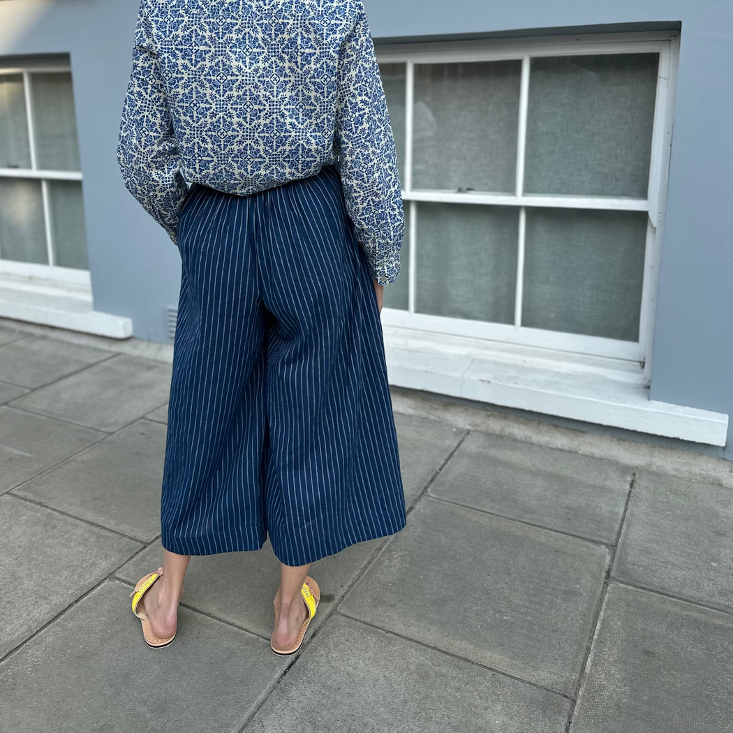 In indigo cotton, these striped trousers by Matta are a wonderful addition to your summer wardrobe. They are wide legged, giving a culotte feel, with a fitted waist and a side button closure.