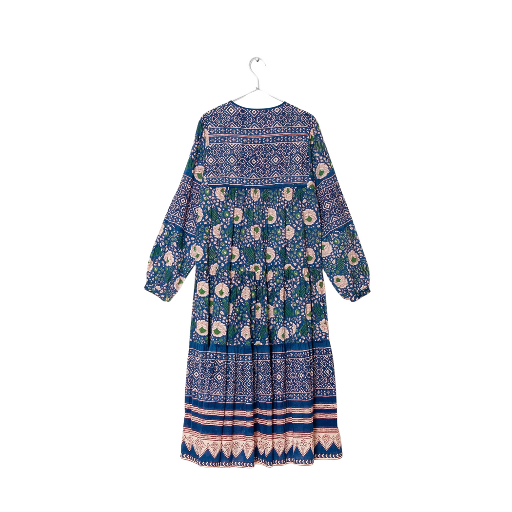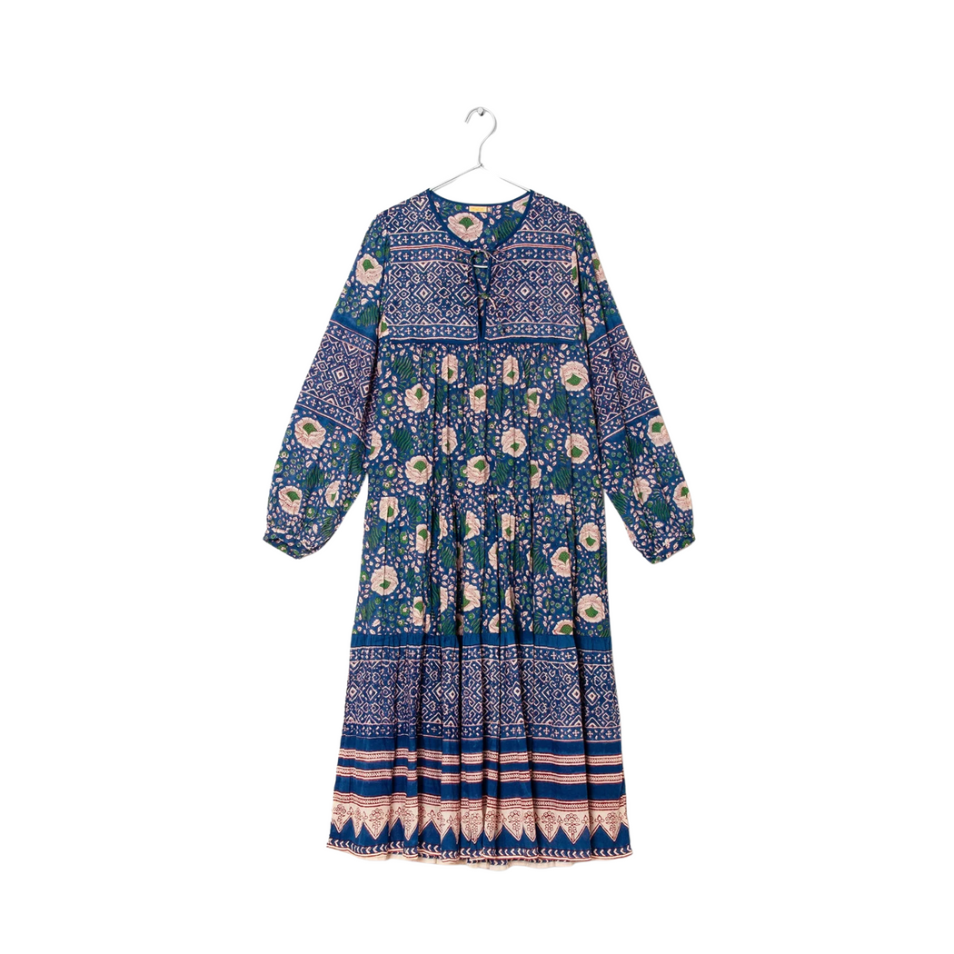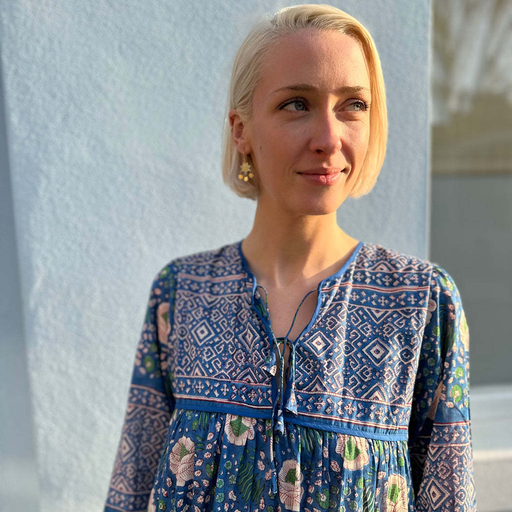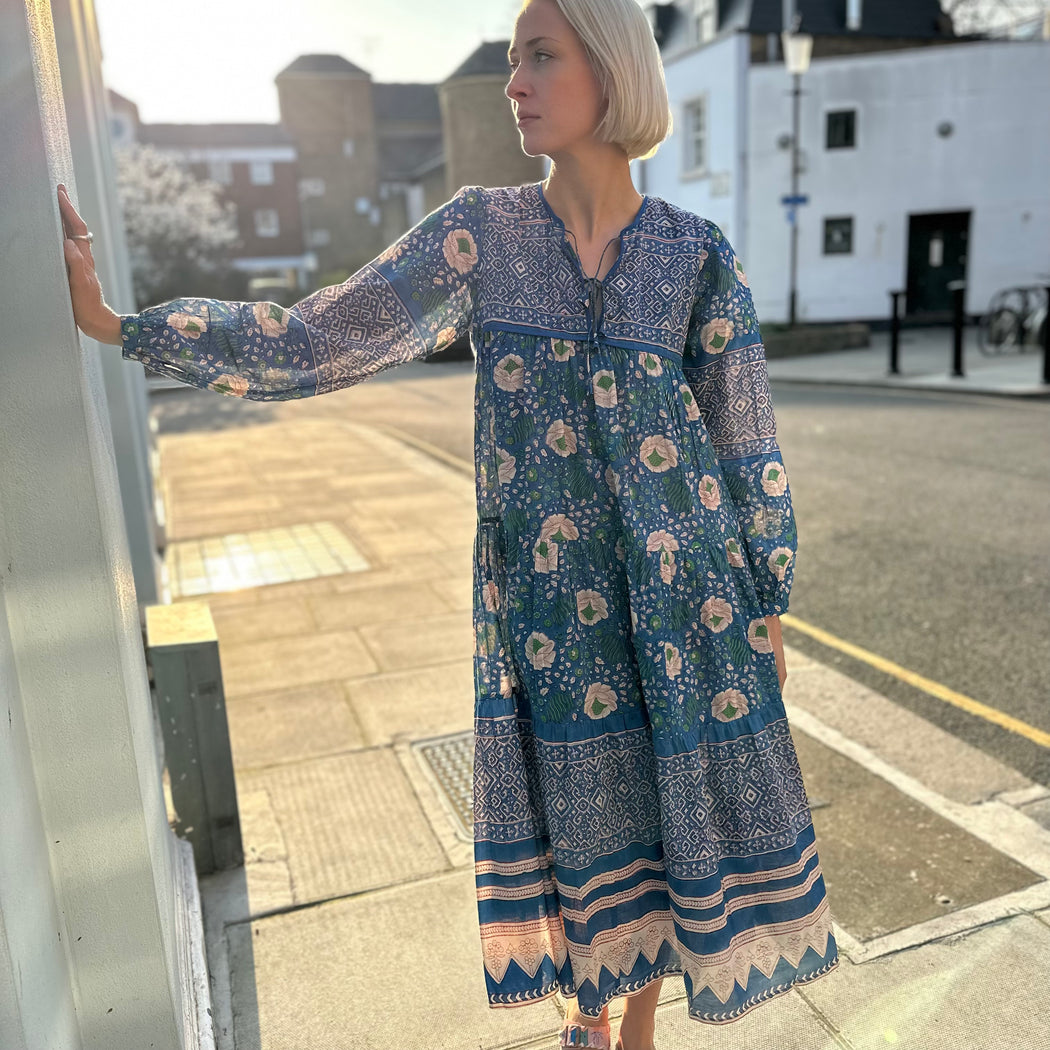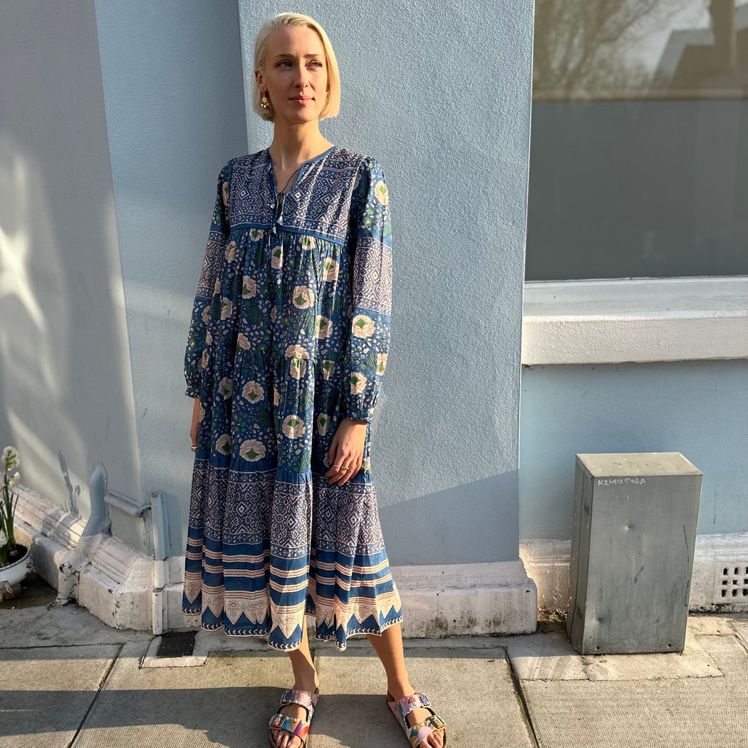 The Yamini dress has been a core Matta style for many summers now embodying a re-envisioned interpretation of classic Indian textiles. The silhouette is a modified, wearable version of a traditional folk shape. It exudes a vintage vibe with a current, relevant edge. A firm favourite returns, the booj blockprint returns in a beautiful Topkapi Blue colour.