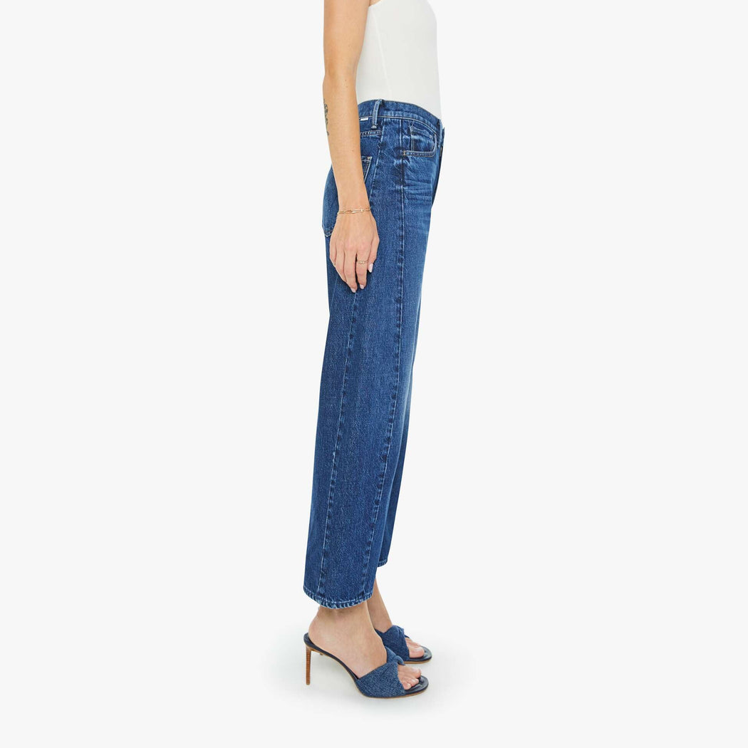 A super high-waisted jean with a wide, curved leg, an ankle-length inseam and a clean hem. Made from SUPERIOR denim, Did You Bring Me Anything? is a dark blue wash with whiskering and fading at the knees.