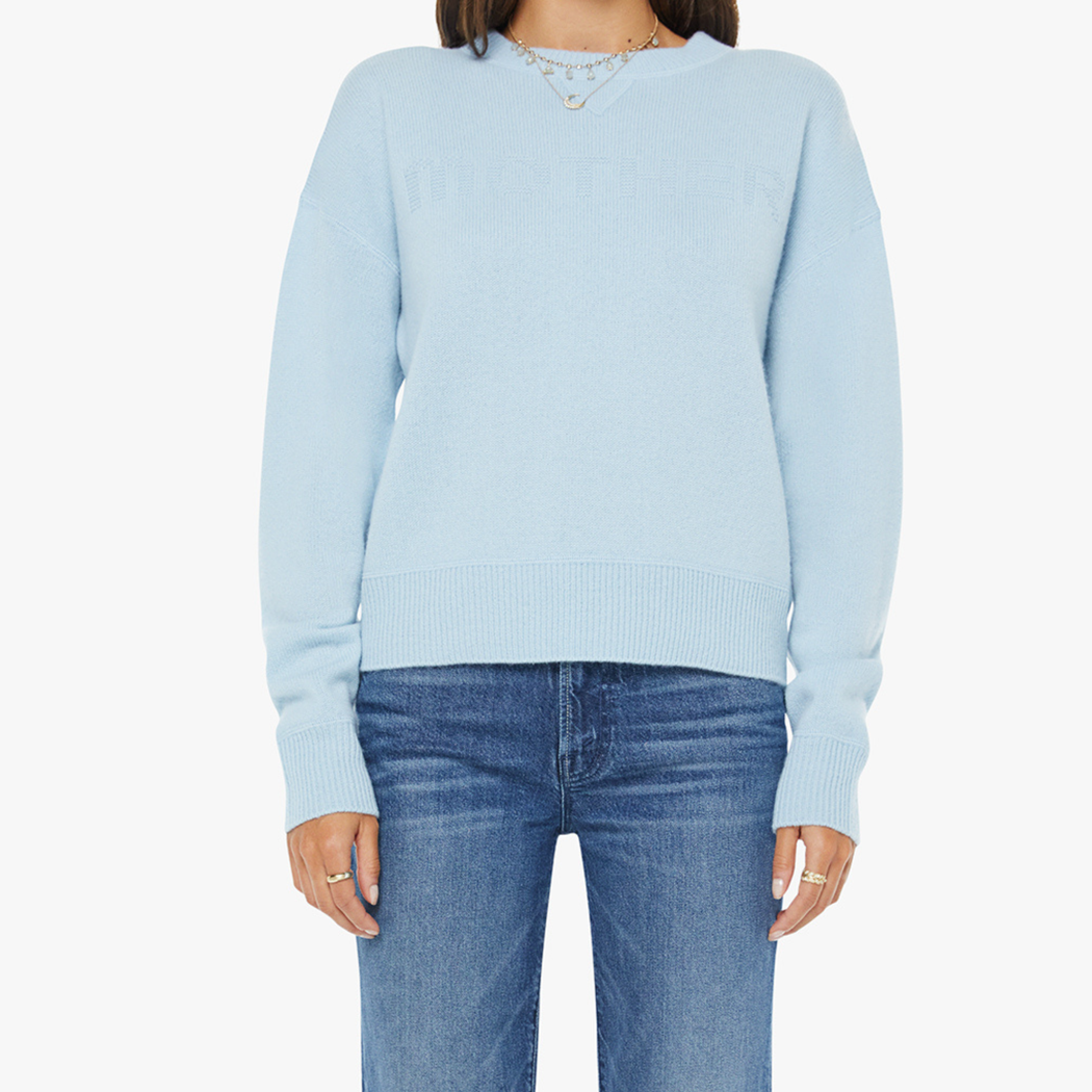 An expanded collection of foundational pieces designed for All Day, Every Day. Created for versatility, layering, and year-round wearability, these are the pieces you will never stop reaching for. A crewneck sweater with drop shoulders, ribbed hems and an oversized fit. The Logo Jumper is made from 100% cashmere in light blue with MOTHER's name across the chest.