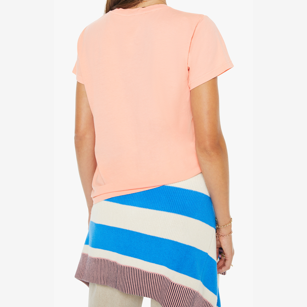 A soft crewneck with a slim fit for a vintage look and feel. Made from 100% supima cotton in peach, the tee features a small cat and MOTHER's name in red on the front.